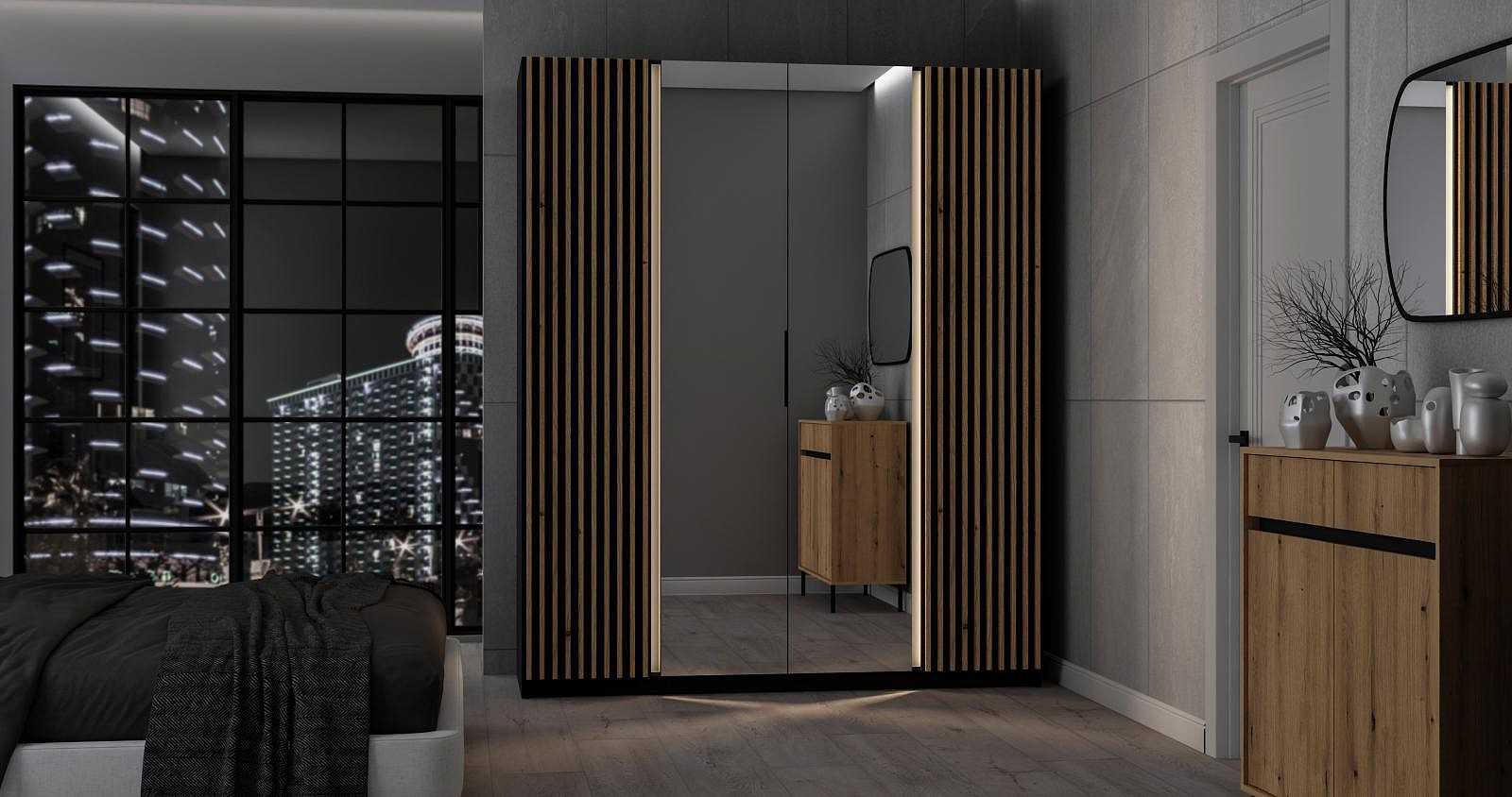 Šatní skříň Keny XII v moderním designu má šířku 200 cm a je rozdělena na tři praktické části. Vnitřní uspořádání kombinuje závěsnou tyč a 11 polic, což umožňuje přehledné a praktické rozdělení šatníku.