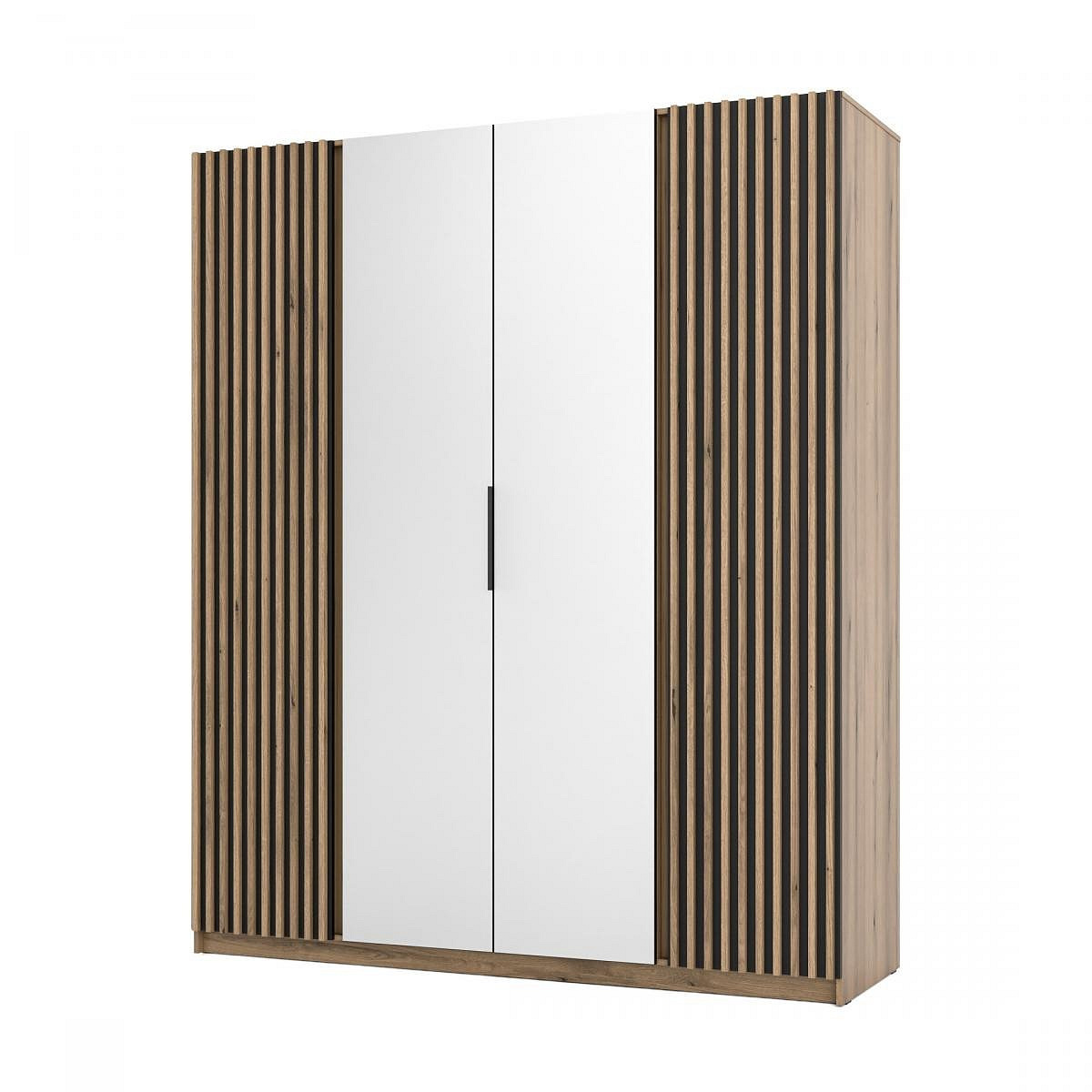 Šatní skříň Keny XII v moderním designu má šířku 200 cm a je rozdělena na tři praktické části. Vnitřní uspořádání kombinuje závěsnou tyč a 11 polic, což umožňuje přehledné a praktické rozdělení šatníku.