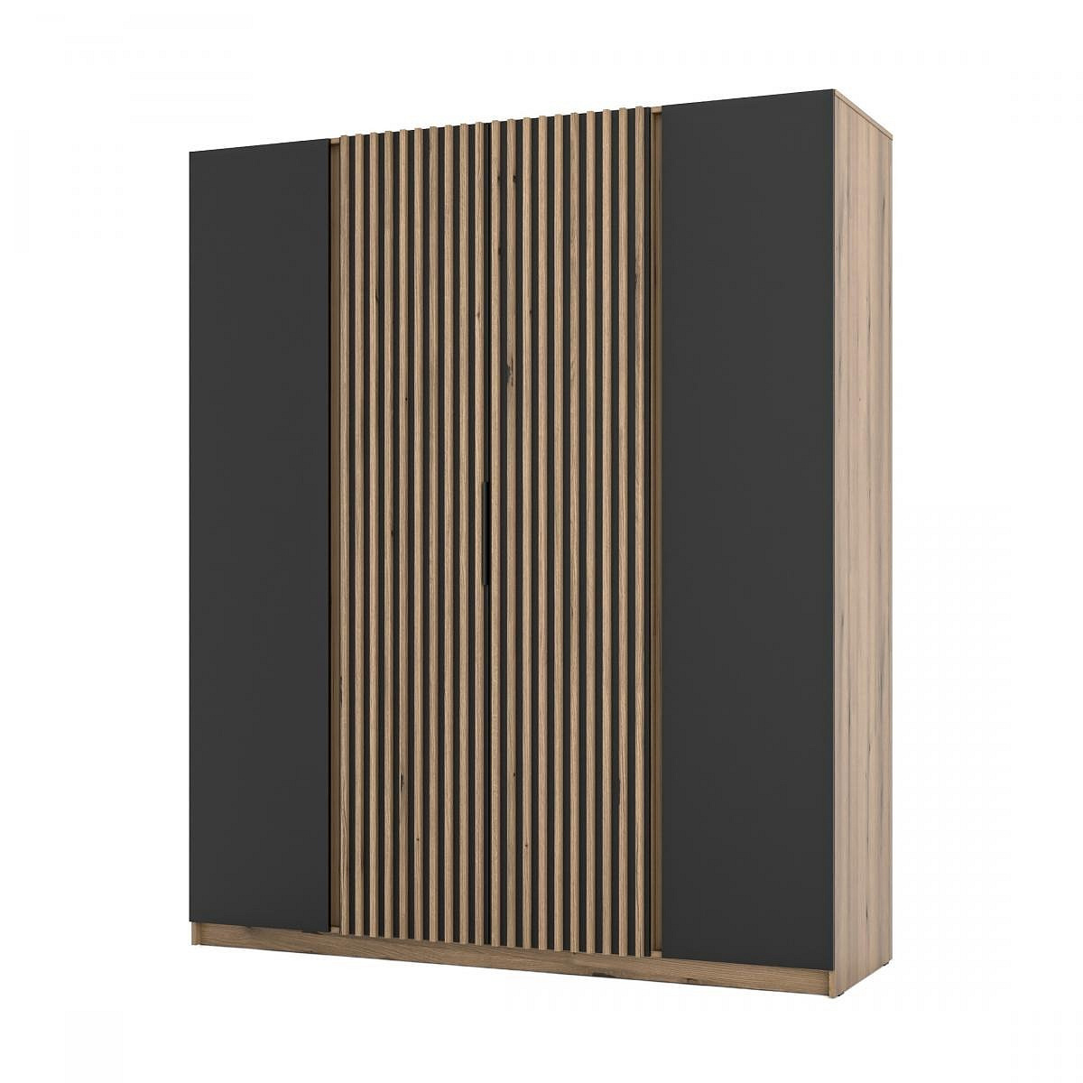 Šatní skříň Keny XIII v moderním designu má šířku 200 cm a je rozdělena na tři praktické části. Vnitřní uspořádání kombinuje závěsnou tyč a 11 polic, což umožňuje přehledné a praktické rozdělení šatníku.