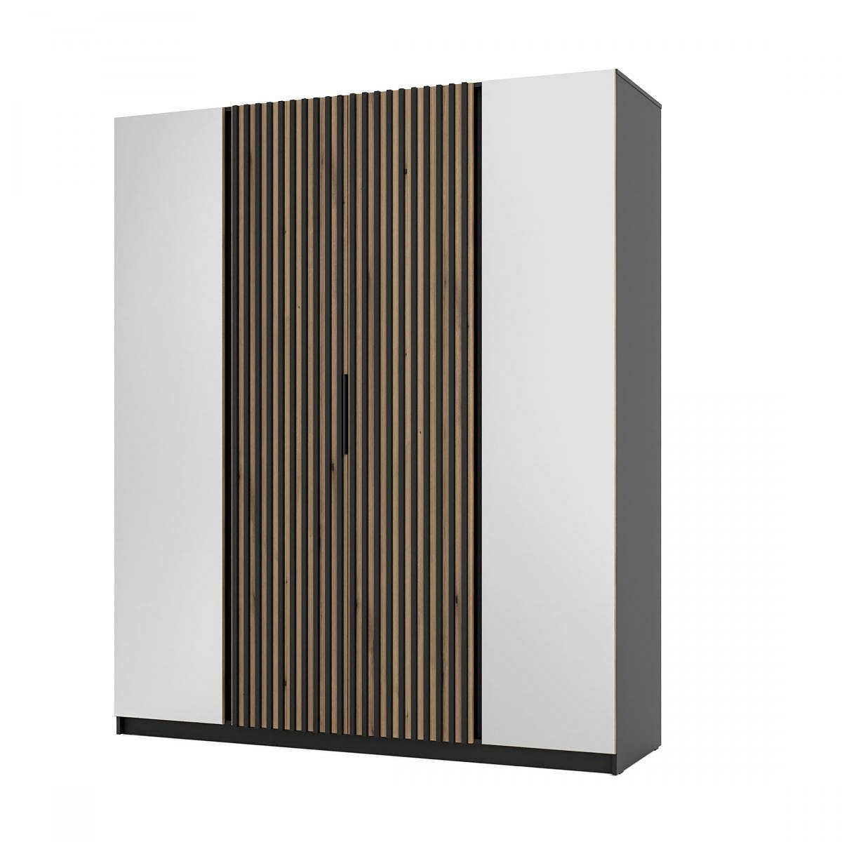Šatní skříň Keny XIV v moderním designu má šířku 200 cm a je rozdělena na tři praktické části. Vnitřní uspořádání kombinuje závěsnou tyč a 11 polic, což umožňuje přehledné a praktické rozdělení šatníku.
