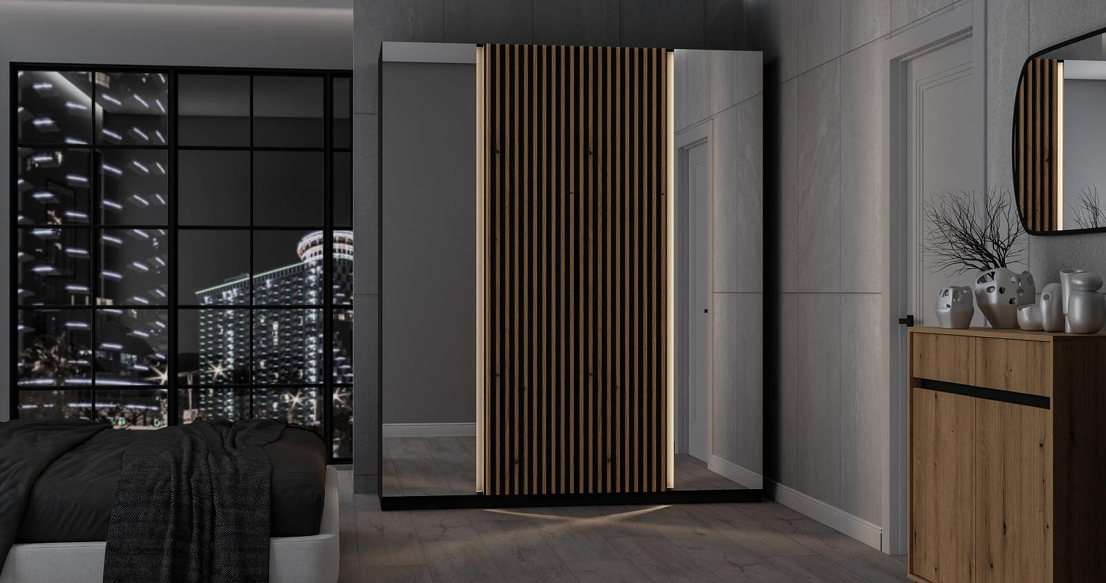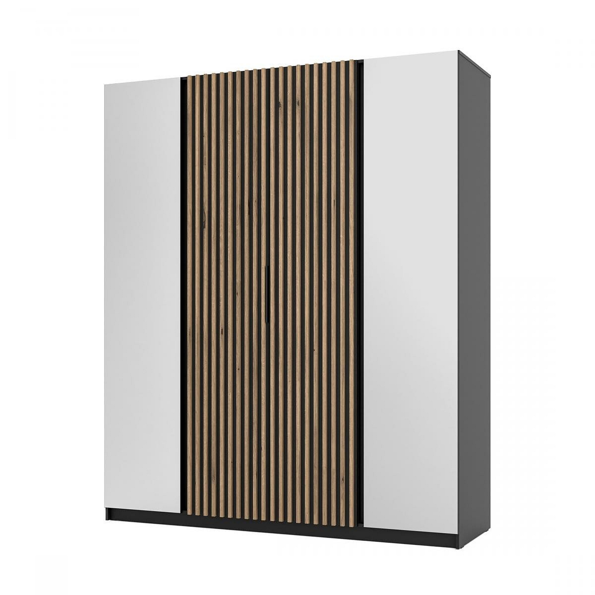 Šatní skříň Keny XIV v moderním designu má šířku 200 cm a je rozdělena na tři praktické části. Vnitřní uspořádání kombinuje závěsnou tyč a 11 polic, což umožňuje přehledné a praktické rozdělení šatníku.