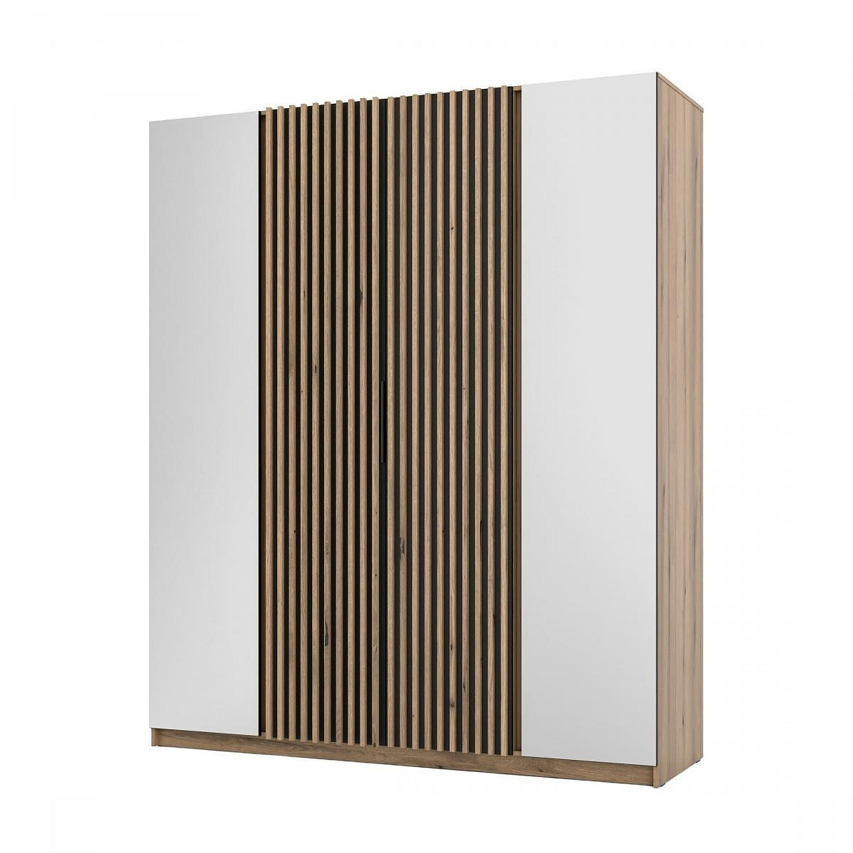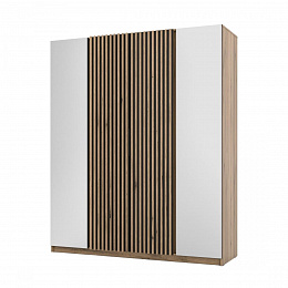 Šatní skříň Keny XIV v moderním designu má šířku 200 cm a je rozdělena na tři praktické části. Vnitřní uspořádání kombinuje závěsnou tyč a 11 polic, což umožňuje přehledné a praktické rozdělení šatníku.