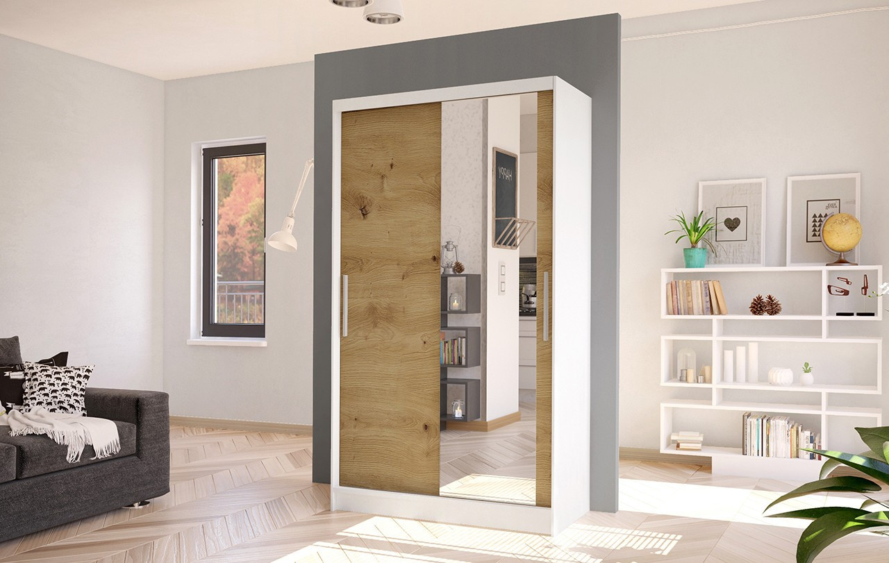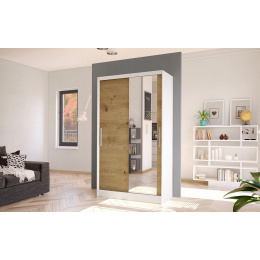 Šatní skříň Kosta VI v moderním designu má šířku 100 cm a je rozdělena na dvě praktické části. Posuvné dveře šetří místo a usnadňují přístup do interiéru. Vnitřní uspořádání kombinuje závěsnou tyč a čtyři police, což umožňuje přehledné a praktické rozdělení šatníku.