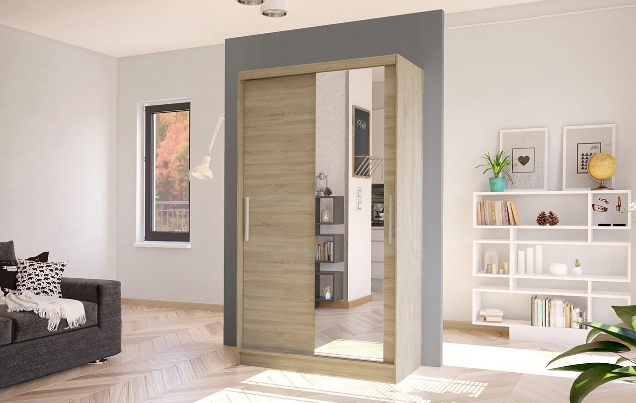 Šatní skříň Kosta VI v moderním designu má šířku 100 cm a je rozdělena na dvě praktické části. Posuvné dveře šetří místo a usnadňují přístup do interiéru. Vnitřní uspořádání kombinuje závěsnou tyč a čtyři police, což umožňuje přehledné a praktické rozdělení šatníku.