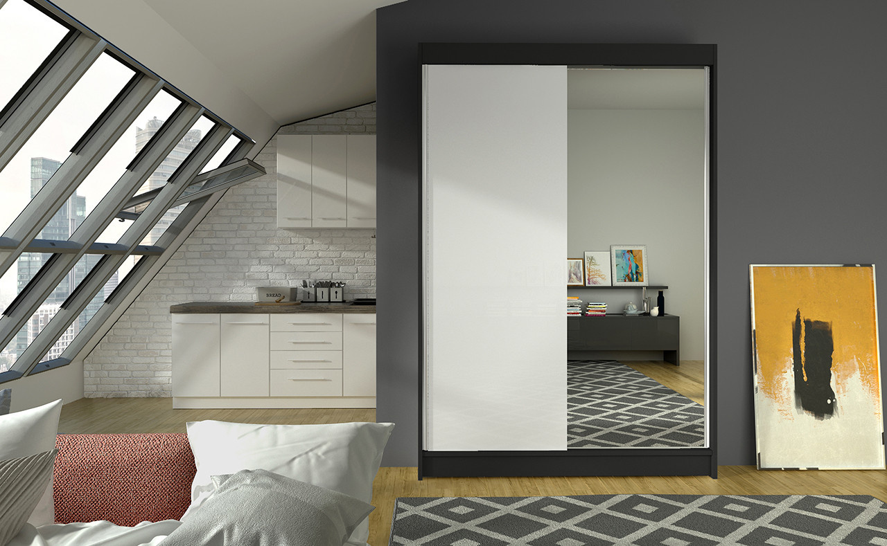 Skříň je vyrobena z kvalitního lamina. Díky svému vnitřnímu uspořádání nabízí dostatek úložného prostoru, posuvné dveře šetří prostor a zrcadlo ho opticky zvětšuje. Skříň je vhodná do ložnice, dětského nebo studentského pokoje, do předsíně i kanceláře. Vnitřní uspořádání skříně je vyobrazeno na fotografii. Skříň je dodávána v demontu. Součástí je i skleněné zrcadlo, které je nalepeno na jedné části dveří skříně a také montážní plánek včetně všech potřebných spojovacích materiálů. Vyobrazené dekorace nejsou v ceně.