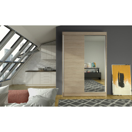 Skříň je vyrobena z kvalitního lamina. Díky svému vnitřnímu uspořádání nabízí dostatek úložného prostoru, posuvné dveře šetří prostor a zrcadlo ho opticky zvětšuje. Skříň je vhodná do ložnice, dětského nebo studentského pokoje, do předsíně i kanceláře. Vnitřní uspořádání skříně je vyobrazeno na fotografii. Skříň je dodávána v demontu. Součástí je i skleněné zrcadlo, které je nalepeno na jedné části dveří skříně a také montážní plánek včetně všech potřebných spojovacích materiálů. Vyobrazené dekorace nejsou v ceně.