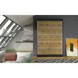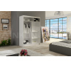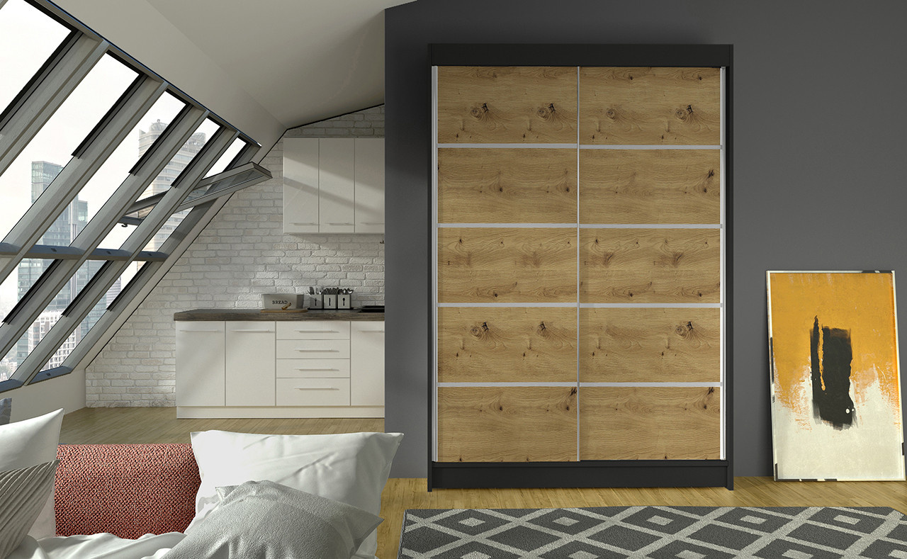 Skříň je vyrobena z kvalitního lamina. Díky svému vnitřnímu uspořádání nabízí dostatek úložného prostoru a posuvné dveře prostor šetří. Skříň je vhodná do ložnice, dětského nebo studentského pokoje, do předsíně i kanceláře. Vnitřní uspořádání skříně je vyobrazeno na fotografii. Skříň je dodávána v demontu a součástí je montážní plánek včetně všech potřebných spojovacích materiálů. Vyobrazené dekorace nejsou v ceně.