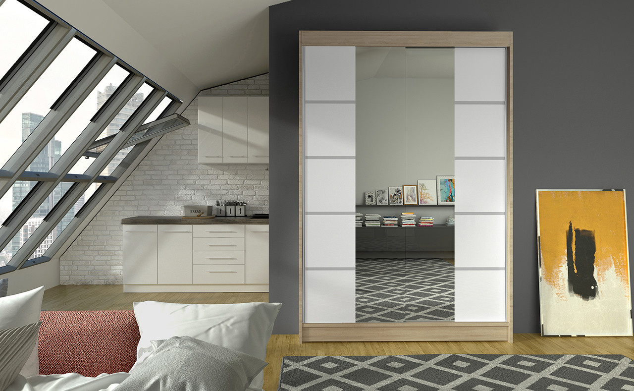 Skříň je vyrobena z kvalitního lamina. Díky svému vnitřnímu uspořádání nabízí dostatek úložného prostoru, posuvné dveře šetří prostor a zrcadlo ho opticky zvětšuje. Skříň je vhodná do ložnice, dětského nebo studentského pokoje, do předsíně i kanceláře. Vnitřní uspořádání skříně je vyobrazeno na fotografii. Skříň je dodávána v demontu. Součástí jsou i skleněná zrcadla, která jsou nalepena na dveřích skříně a také montážní plánek včetně všech potřebných spojovacích materiálů. Vyobrazené dekorace nejsou v ceně.