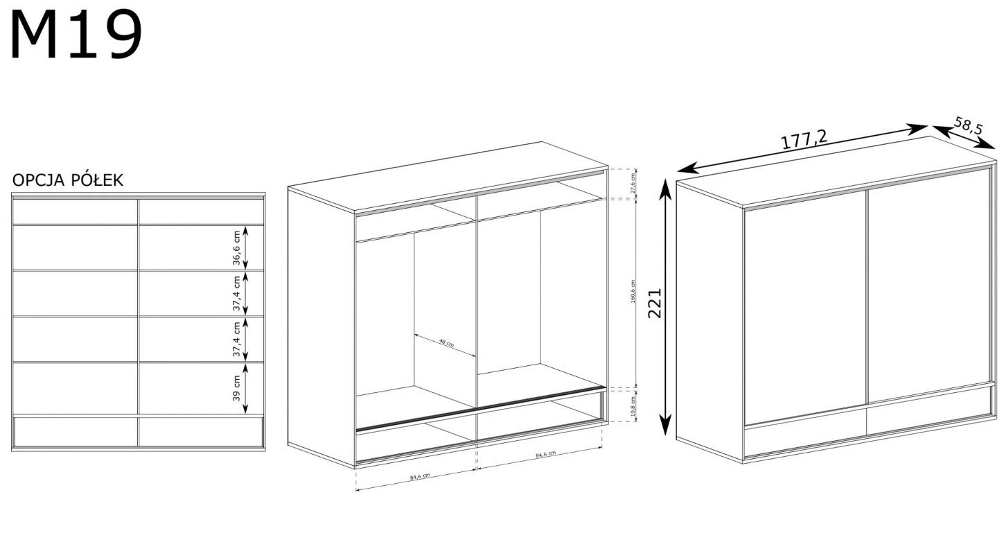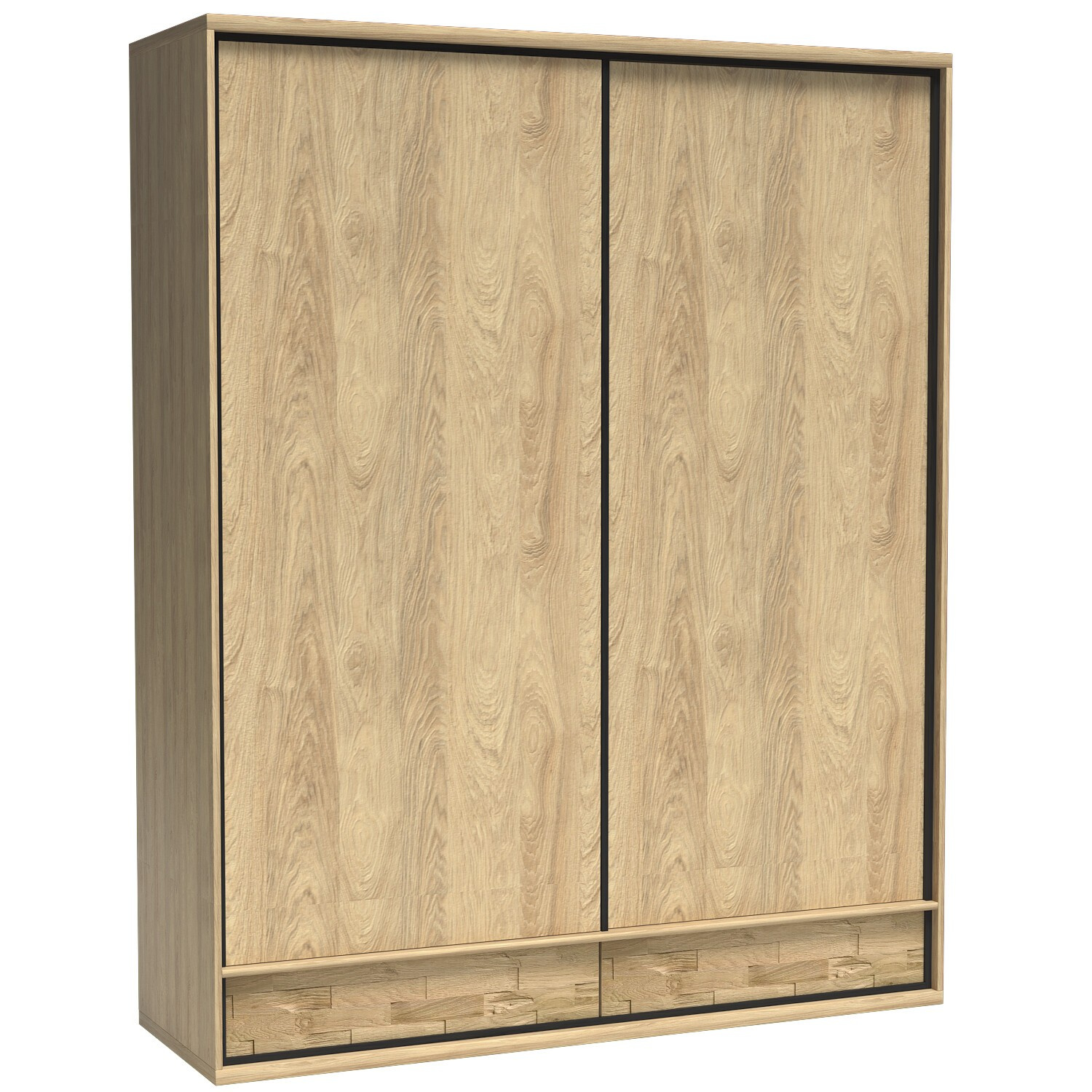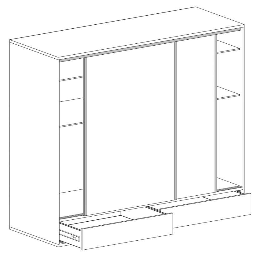 Jednoduchá velká šatní skříň s posuvnými dveřmi pro uložení oblečení. Má krásné černé lemování. Teplá, světlá barva nábytku se hodí do každého interiéru, avšak použité tmavé akcenty jsou inspirovány loftovým stylem. Skříň má tyč, na kterou můžeme snadno pověsit oblečení. Ve spodní části jsou dvě prostorné zásuvky, které se otevírají dotykem. Díky velkému počtu polic můžeme snadno uspořádat složené věci. Je také možné vyměnit přední desku za zdobenou dubovou.