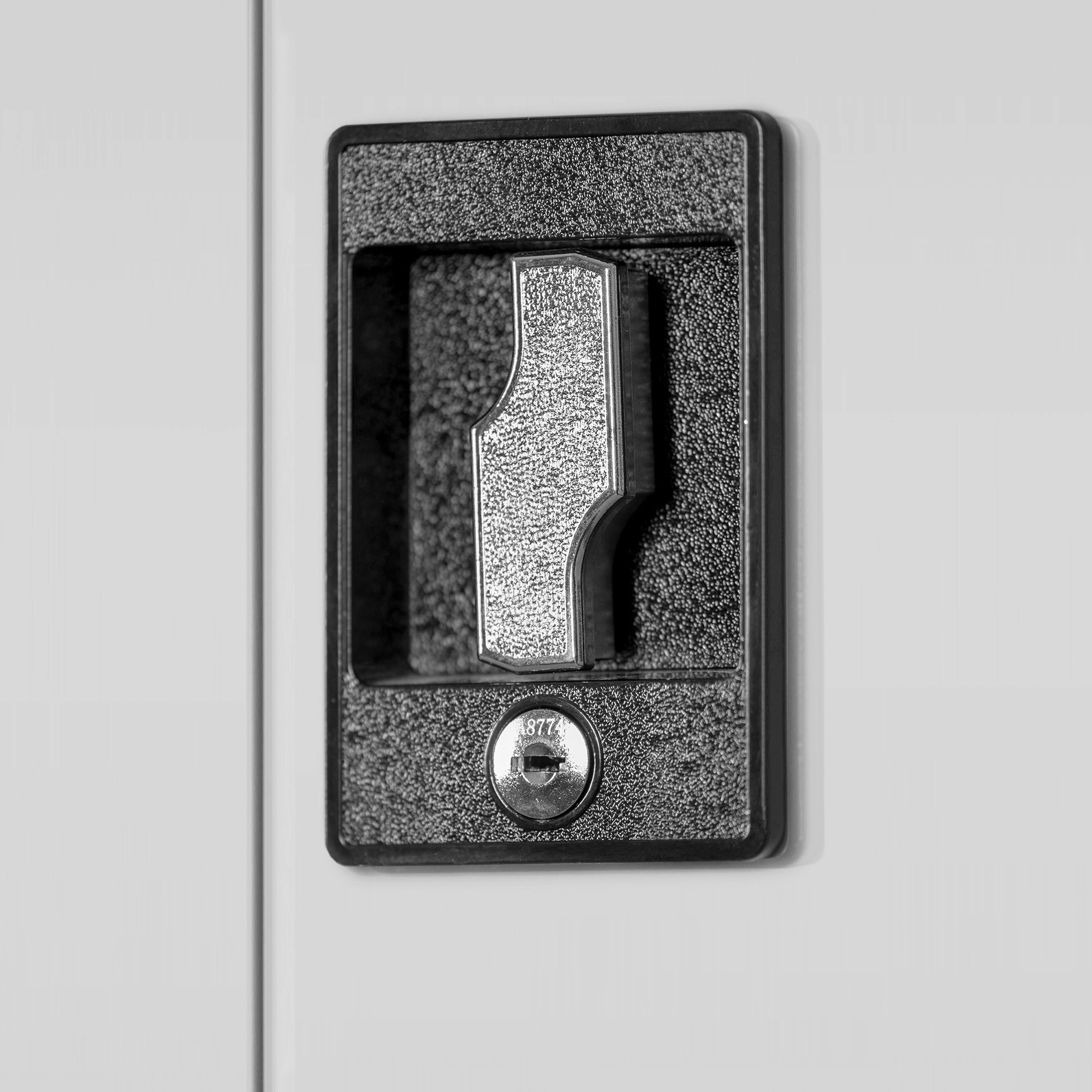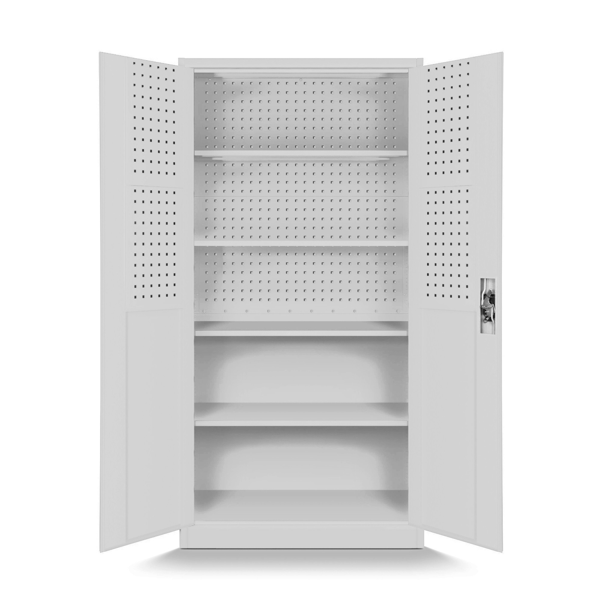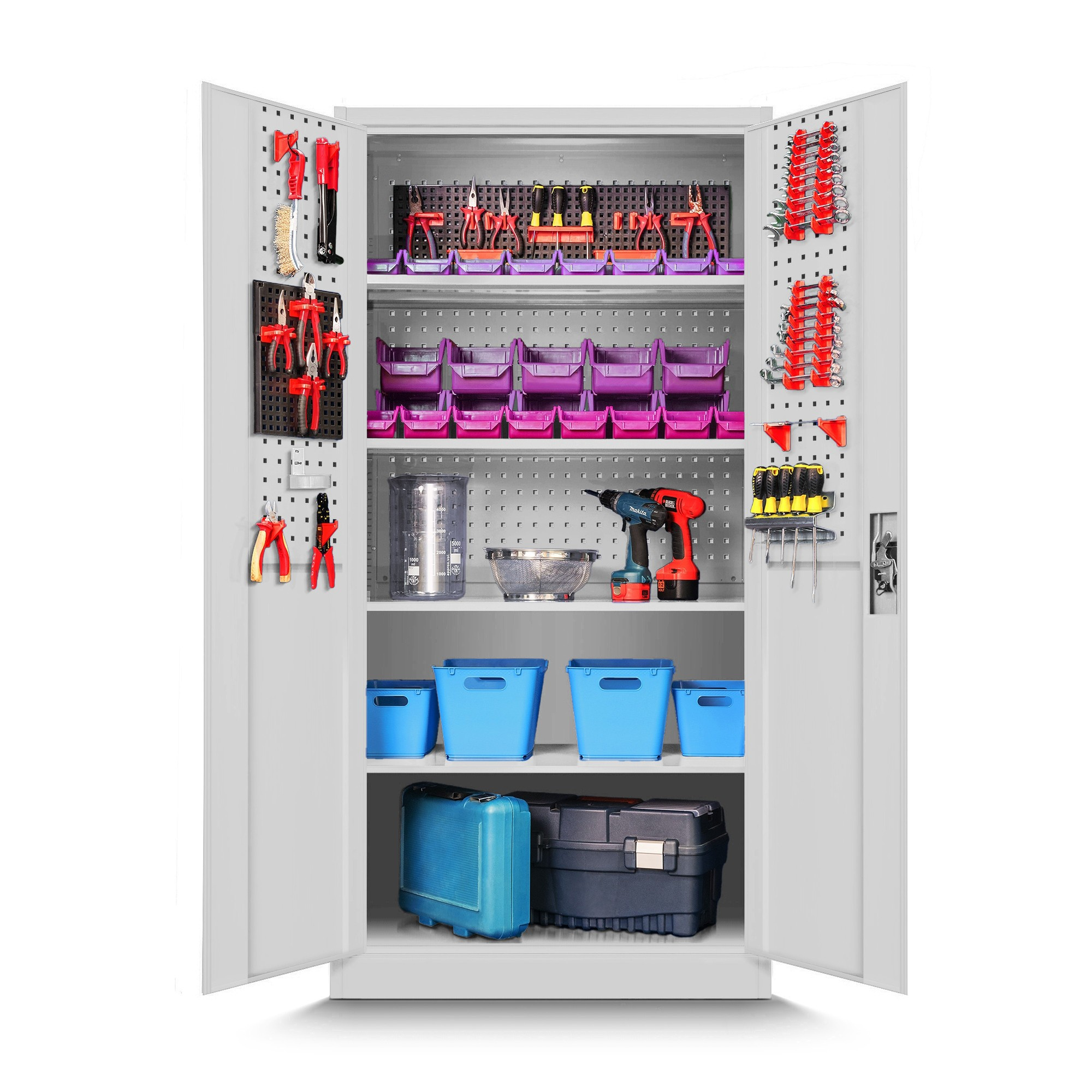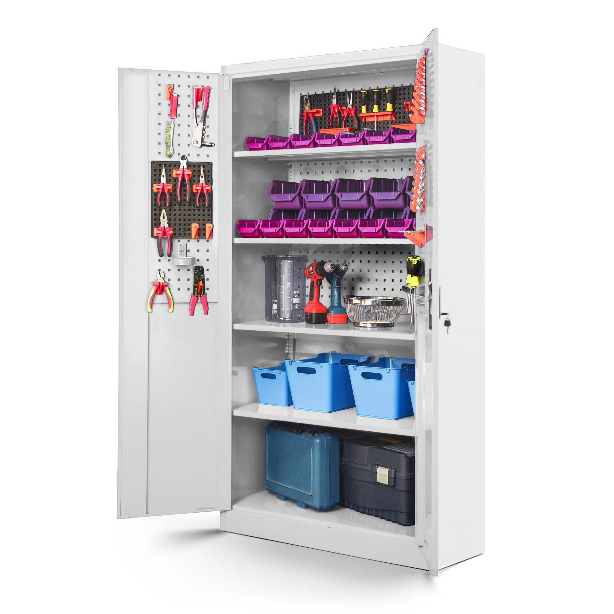 Skříň na nářadí BRUNO – neocenitelná pomoc v dílně Kovová skříň do dílny BRUNO je obrovským usnadněním při ukládání nářadí. Bez nejmenšího problému do skříně umístíte vše, co je nezbytné pro efektivní práci v dílně. Funkční řešení umožňují chytré uspořádání nástrojů a uspořádání dílenského prostoru. Dobrá organizace na takovém místě je zárukou bezpečné a komfortní práce.Odolná kovová skříň Nástrojová skříň BRUNO je vyrobena z vysoce kvalitní oceli o tloušťce 0,8 mm a všechny její části jsou pokryty vrstvou práškového laku. Díky tomu je skříň mimořádně pevná a odolná vůči mechanickému poškození a korozi. Ani dlouhá léta pobytu v méně příznivých dílenských podmínkách s nízkou teplotou a vysokou vlhkostí neovlivní negativně kondici a vzhled skříně. Skříň BRUNO zůstává velmi estetická po celou dobu.Přesně nastavitelné police Při uspořádání vnitřku skříně hrají hlavní roli 4 police s možností nastavení výšky každých 25 mm. Lze tedy přizpůsobovat uspořádání polic v závislosti na potřebách a velikosti nástrojů. Velká nosnost polic – každá po 80 kg – zajišťuje, že všechny nástroje a potřebné předměty v dílně se vejdou do jedné skříně. Další prostor poskytuje spodní výklenek, do kterého lze umístit nejtěžší věci.Perforované desky zvyšující pohodlí a ergonomii Aby maximálně usnadnily práci v dílně, kovová skříň BRUNO má perforované desky na třech místech. Nacházející se na zadní stěně skříně a na vnitřní straně dveří tabule umožňují skvěle využít každý centimetr plochy a ušetřit cenný prostor dílny. Do otvorů stačí umístit vhodné háčky a zavěsit na ně nástroje. Tímto způsobem máš oblíbené nástroje vždy po ruce a už neztrácíš čas jejich hledáním.Bezpečné ukládání nástrojů Dílenské nástroje by neměly být umístěny na veřejně přístupném místě. Právě pro bezpečnost jak vaši, tak i vašeho okolí, je ve skříni BRUNO namontován spolehlivý zámek zajištěný ve 3 bodech. Zaručuje to, že k obsahu skříně nebudou mít přístup neoprávněné osoby. Díky dvěma sadám klíčů máte plnou kontrolu nad tím, kdo může získat přístup ke skříni. Zároveň můžeš schovat v skříňce cenné předměty bez stresu z jejich ztráty. Sada neobsahuje další příslušenství, jako jsou držáky a háčky na nástrojovou desku.