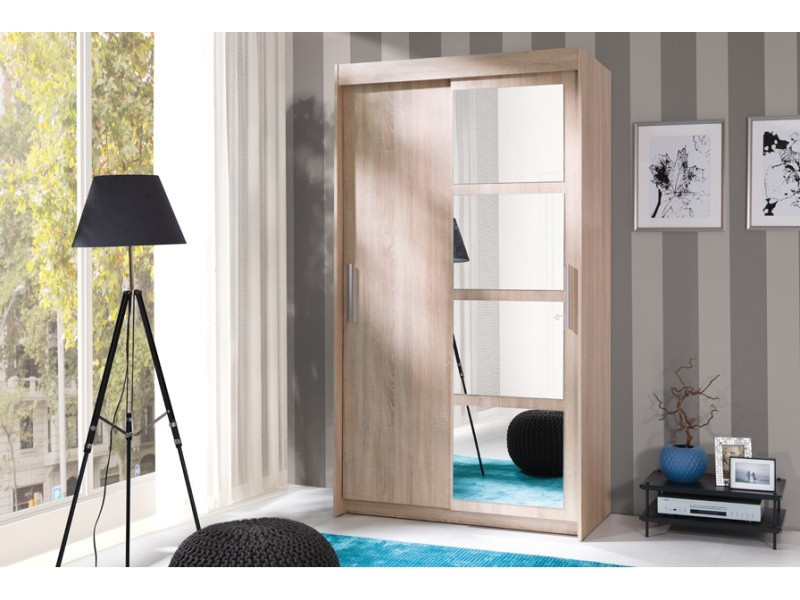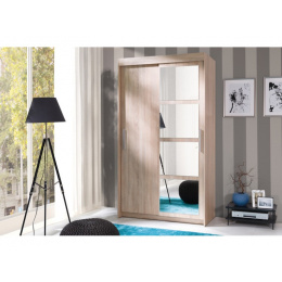 Skříň je vyrobena z kvalitního lamina a díky svému vnitřnímu uspořádání nabízí dostatek úložného prostoru. Díky svým rozměrům je vhodná i do menších pokojů nebo chodeb. Posuvné dveře šetří prostor a zrcadla na dveřích ho opticky zvětší. Součástí je šatní tyč a police. Vnitřní uspořádání skříně je vyobrazeno na fotografii. Skříň je dodávána v demontu. Součástí je montážní plánek včetně všech potřebných spojovacích materiálů.