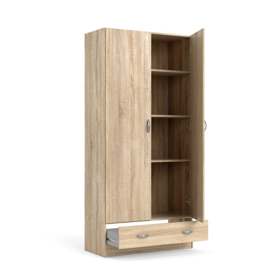 Policová skříň Pegi s praktickou zásuvkou splňuje veškeré požadavky pro ukládání oblečení. Vnitřní uspořádání skříně poskytuje dostatek prostoru na oblečení. Skříň má univerzální využití a je vyrobena z lamina, které je odolné a snadné na údržbu. Skříň je dodávaná v demontu a součástí je montážní plánek včetně všech potřebných spojovacích materiálů. U tohoto typu skříně mohou být některé nepohledové hrany desek nebo plochy neopáskovány v barvě skříně (především vrchní půda či hrany dveří, apod.).