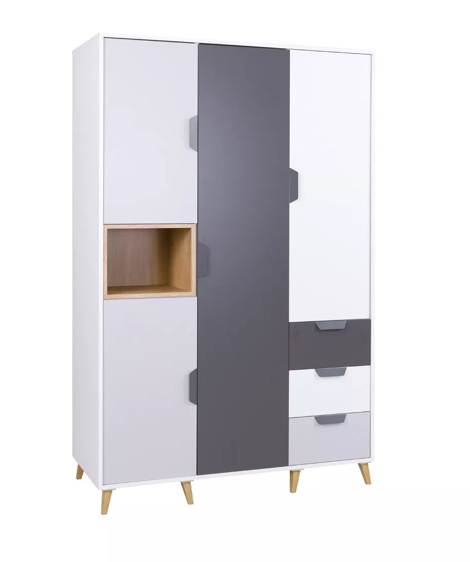 Skříň Poker R1 je vyrobena z lamina v krásném dekoru bílá, grafit, šedá a dub Lefkas. Lamino je odolné a jistě oceníte i velmi snadnou údržbu. Skříň má velký úložný prostor, šuplíky a je doplněna také o polici. Skříň je dodávaná v demontu. Součástí balení je montážní návod včetně všech spojovacích prvků.