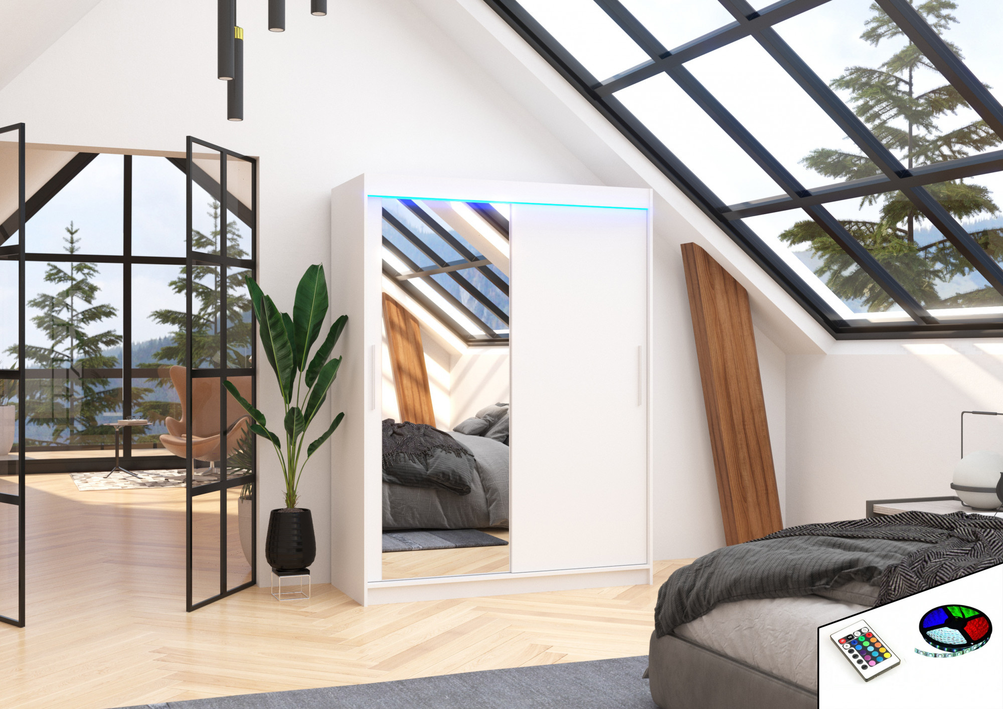 Šatní skříň s posuvnými dveřmi a zrcadlem BIANCO je ideálním způsobem, jak uspořádat prostor. Nábytek je vybaven prostornými policemi a tyčí, na kterou můžete pověsit šaty, obleky, svrchní oděvy nebo košile. Na čelní straně bylo připevněno zrcadlo, které opticky zvětšuje prostor. Díky tomu, že skříň je posuvná, nemusíte vyčleňovat další místo na otevření dveří, což z ní činí ideální řešení pro malý pokoj nebo úzkou předsíň. Zajímavým prvkem je efektní LED osvětlení, které dodává skříni i místnosti nádherný půvab.