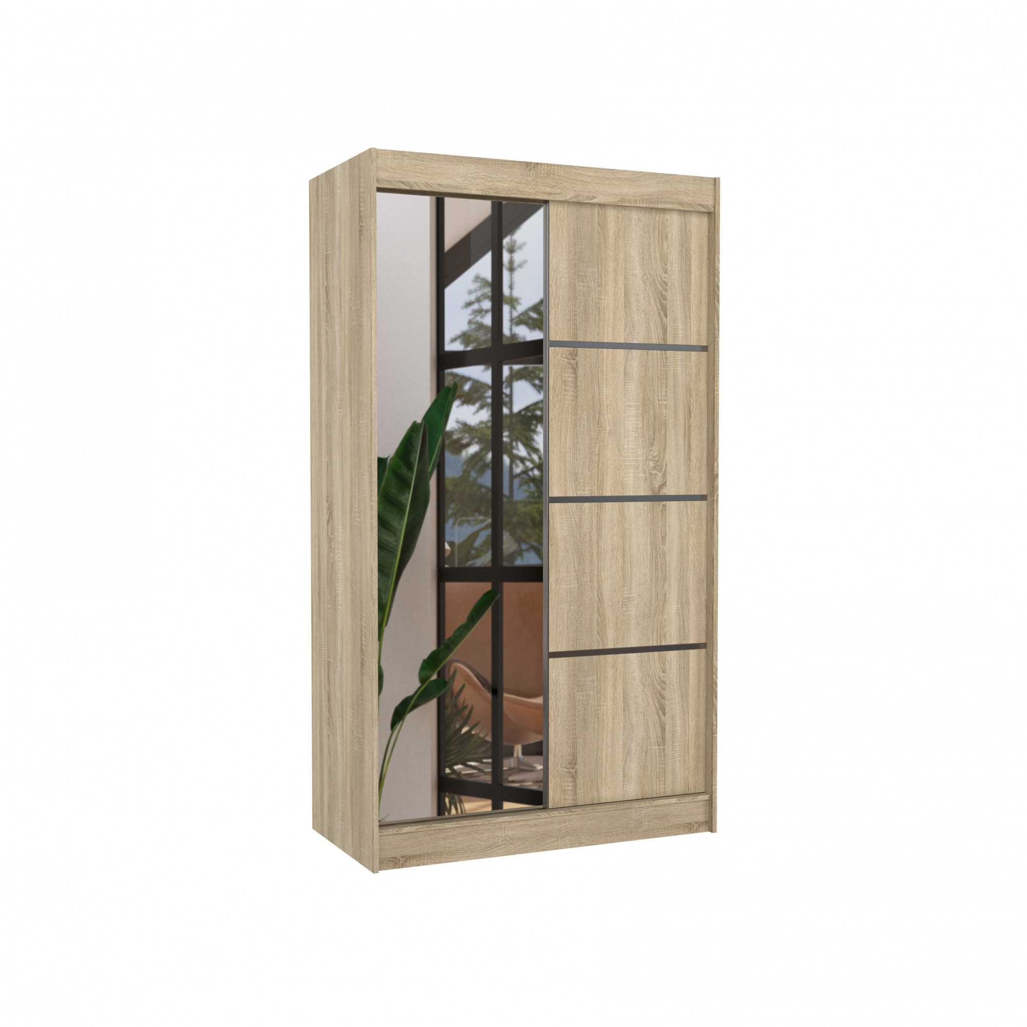 Šatní skříň s posuvnými dveřmi a zrcadlem GILTON je ideálním způsobem, jak uspořádat prostor. Nábytek je vybaven prostornými policemi a tyčí, na kterou můžete pověsit šaty, obleky, svrchní oděvy nebo košile. Na čelní straně bylo připevněno zrcadlo a ozdobné pásky, které dodávají jedinečný styl. Díky tomu, že skříň je posuvná, nemusíte vyčleňovat další místo na otevření dveří, což z ní činí ideální řešení pro malý pokoj nebo úzkou předsíň.