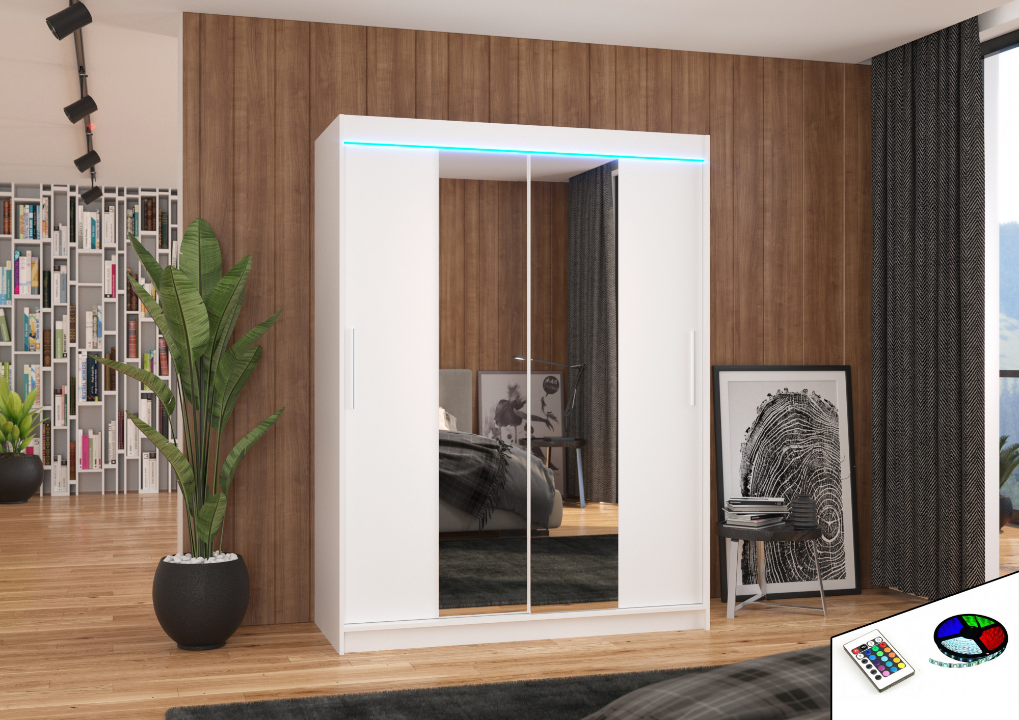 Posuvná skříň se zrcadlem a LED osvětlením INESS 150 Bílá+Bílá