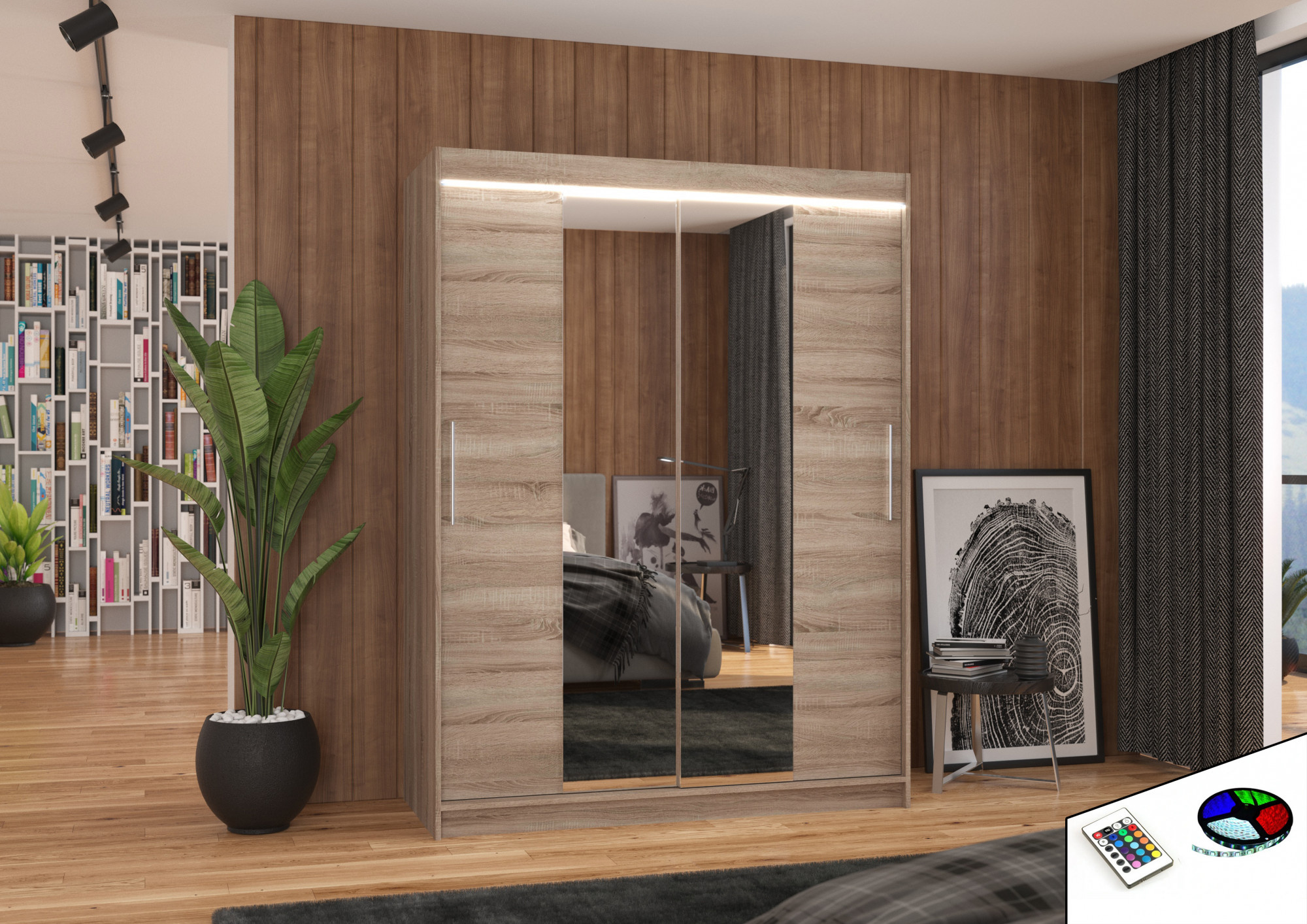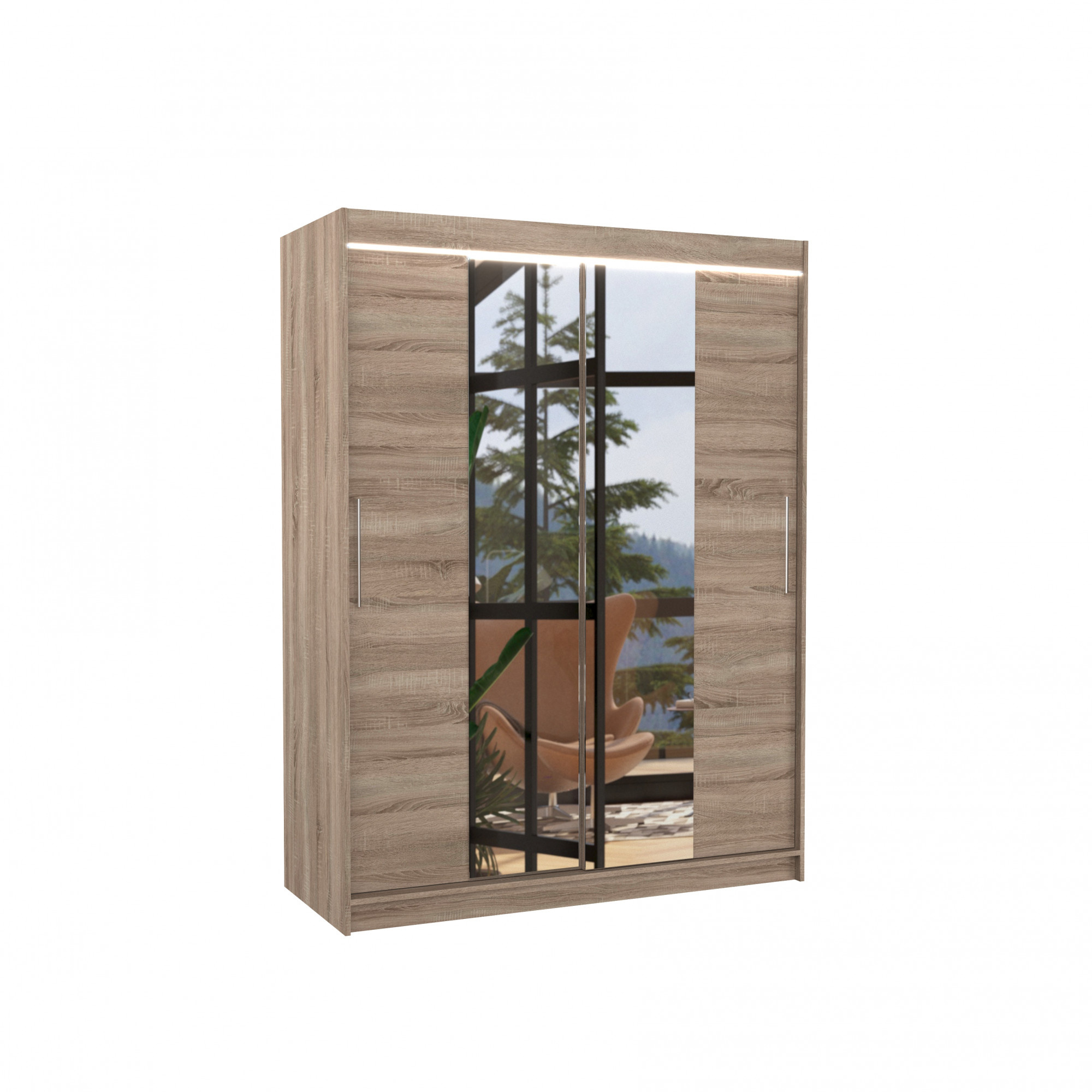 Šatní skříň s posuvnými dveřmi a zrcadlem INESS je ideálním způsobem, jak uspořádat prostor. Nábytek je vybaven prostornými policemi a tyčí, na kterou můžete pověsit šaty, obleky, svrchní oděvy nebo košile. Na obou stranách byla připevněna zrcadla, která opticky zvětšují prostor. Díky tomu, že skříň je posuvná, nemusíte vyčleňovat další místo na otevření dveří, což z ní činí ideální řešení pro malý pokoj nebo úzkou předsíň. Zajímavým prvkem je efektní LED osvětlení, které dodává skříni i místnosti nádherný půvab.