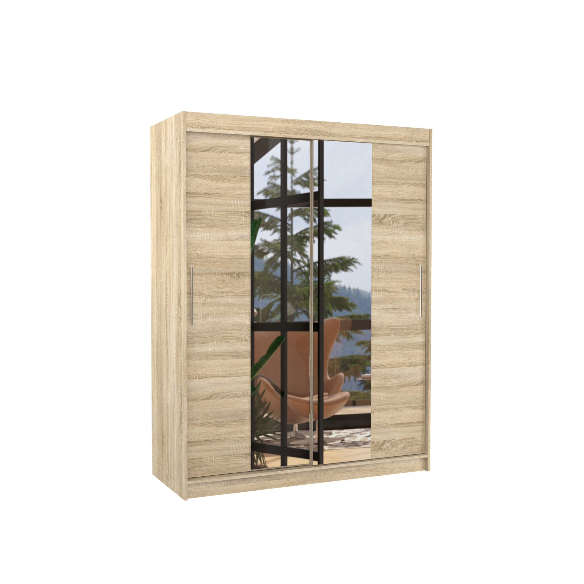 Šatní skříň s posuvnými dveřmi a zrcadlem INESS je ideálním způsobem, jak uspořádat prostor. Nábytek je vybaven prostornými policemi a tyčí, na kterou můžete pověsit šaty, obleky, svrchní oděvy nebo košile. Na obou stranách byla připevněna zrcadla, která opticky zvětšují prostor. Díky tomu, že skříň je posuvná, nemusíte vyčleňovat další místo na otevření dveří, což z ní činí ideální řešení pro malý pokoj nebo úzkou předsíň.