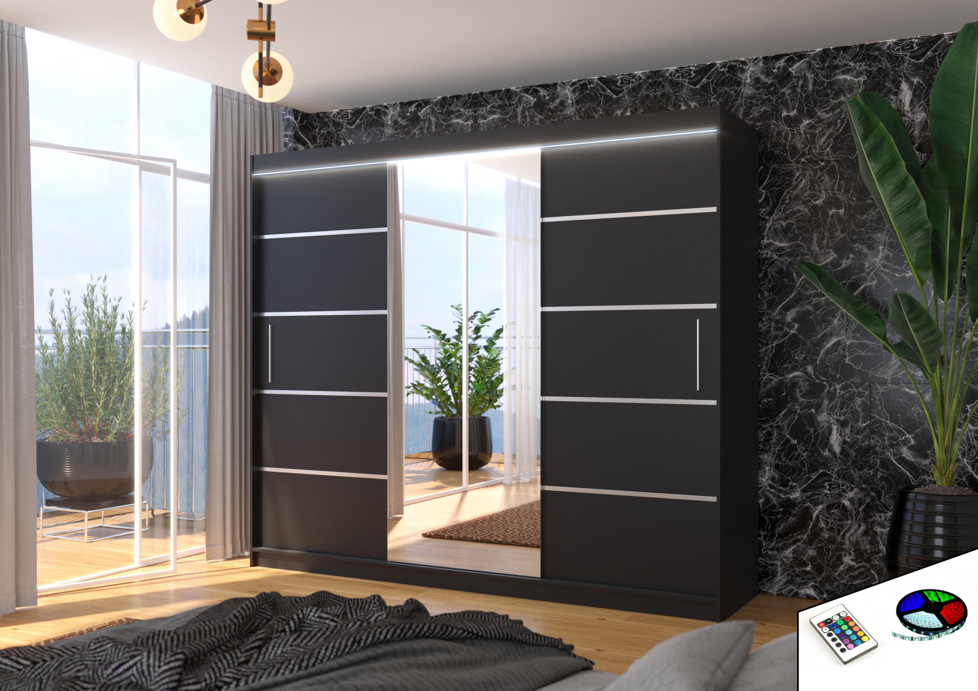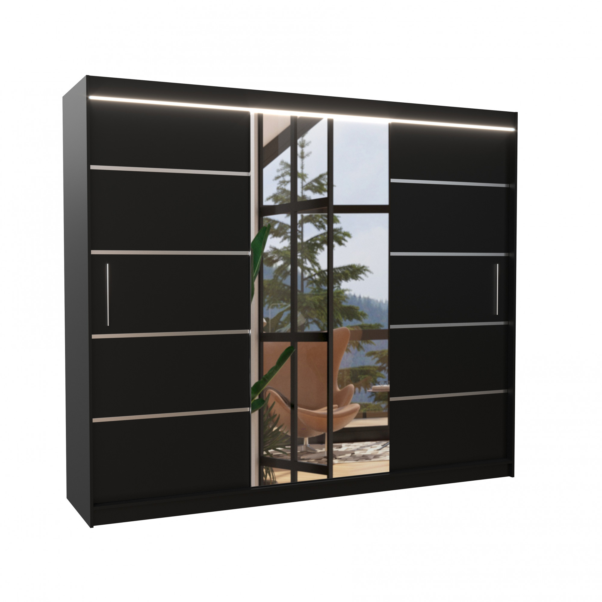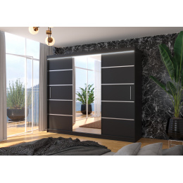 Šatní skříň s posuvnými dveřmi, zrcadlem a LED osvětlením SALTO 250 Černá+Černá