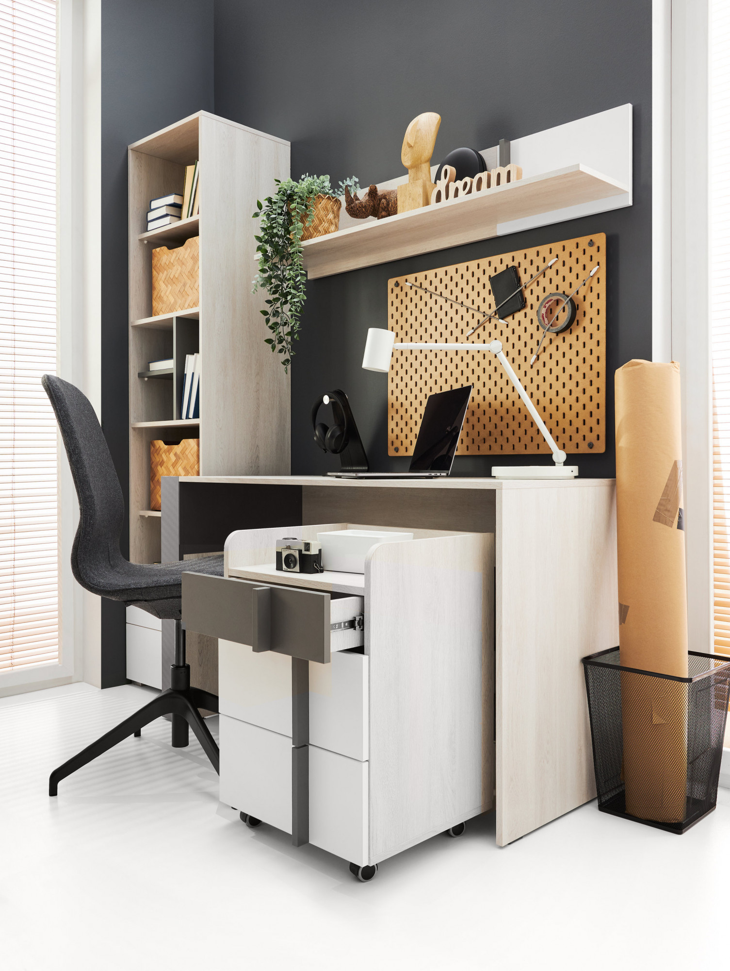 Systém REMO je vyroben v barevném provedení Dub Wilton bílý/Bílá Lux/Antracit. Korpus nábytku je vyroben v barevném odstínu Dub Wilton bílý.