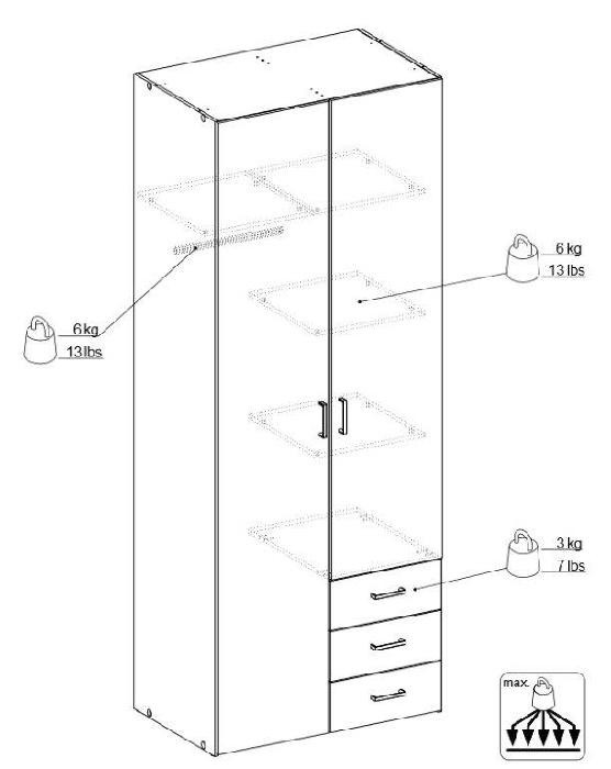 Praktická a moderní šatní skříň dánského výrobce Tvilum. Šatní skříň má část policovou se třemi policemi, 3 zásuvky a část šatní s jednou policí a šatní tyčí (viz nákres s doporučeným zatížením). Skříň je vyrobena z lamina o tloušťce 12 mm a má plastové úchytky. U tohoto typu mohou být některé nepohledové hrany desek nebo plochy neopáskovány v barvě skříně (především vrchní půda či hrany dveří, apod.).
