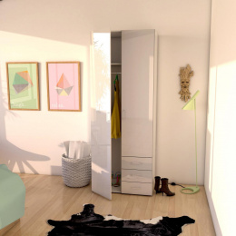 Praktická a moderní šatní skříň dánského výrobce Tvilum. Šatní skříň má část policovou se třemi policemi, 3 zásuvky a část šatní s jednou policí a šatní tyčí (viz nákres s doporučeným zatížením). Skříň je vyrobena z lamina o tloušťce 12 mm a má plastové úchytky. U tohoto typu mohou být některé nepohledové hrany desek nebo plochy neopáskovány v barvě skříně (především vrchní půda či hrany dveří, apod.).