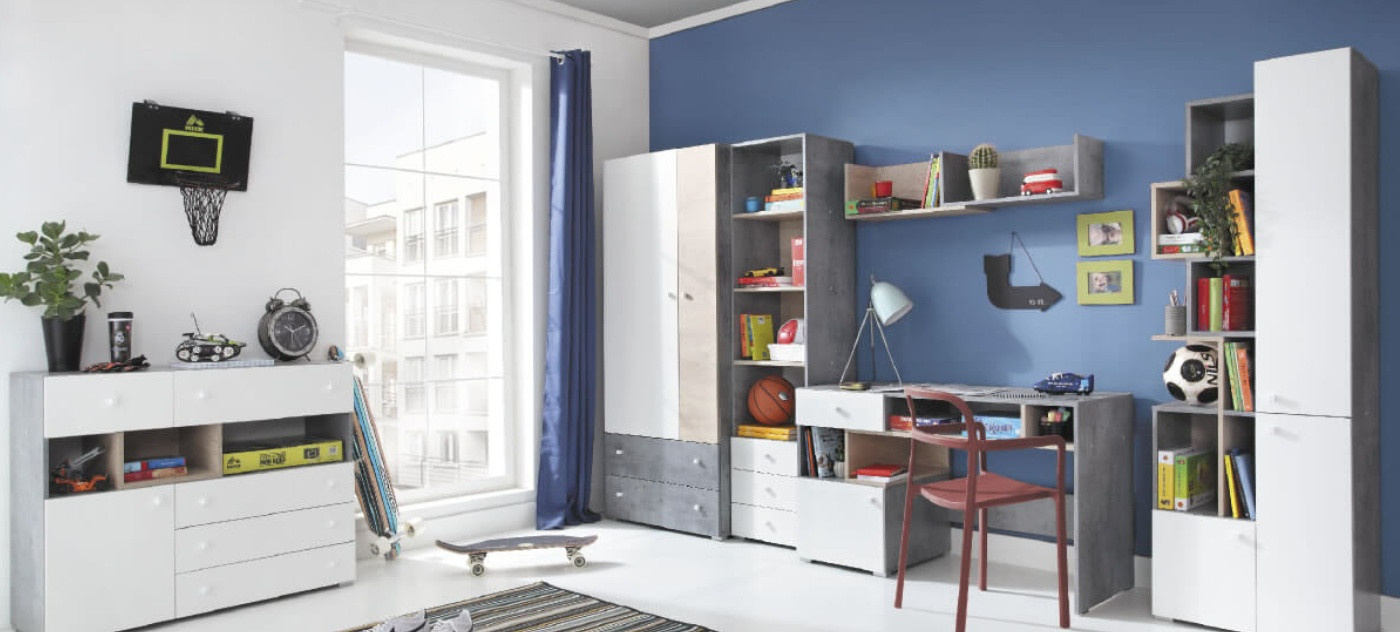 Šatní skříň ze systému SIGMA se vyrábí ve dvou barevných provedeních Beton+Bílý Lux+Dub a Bílý Lux+Beton.