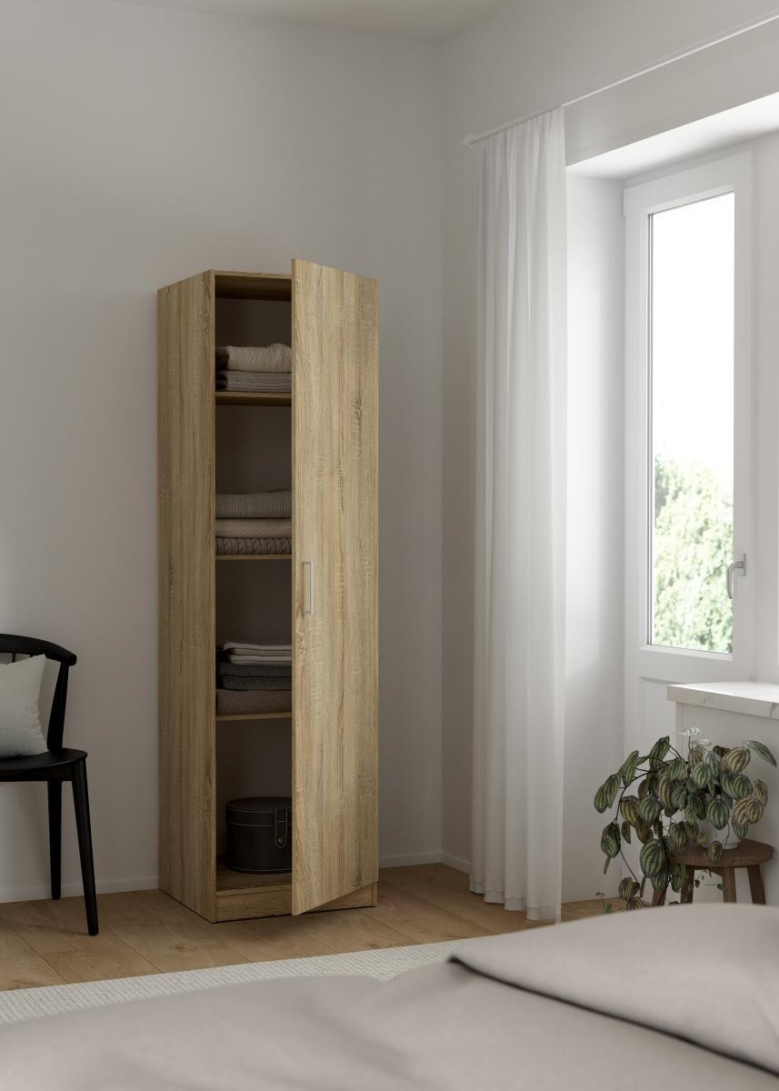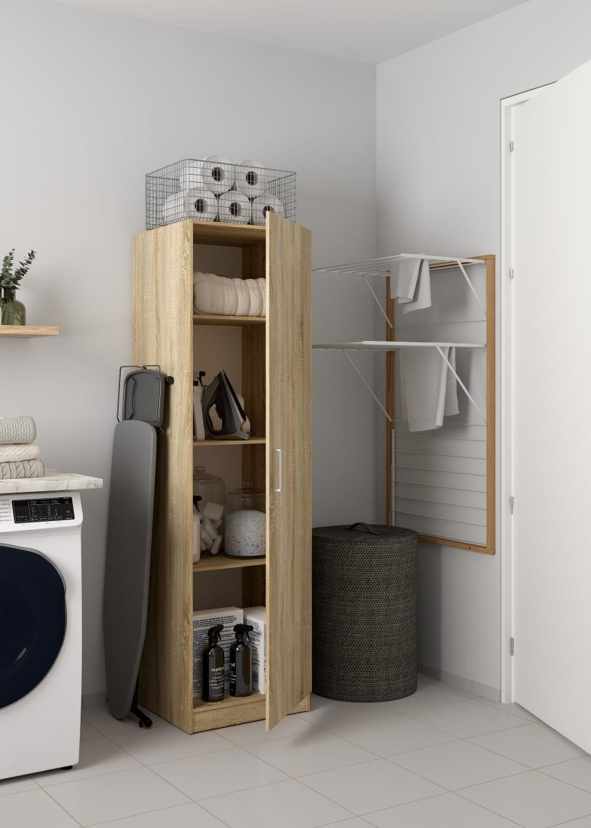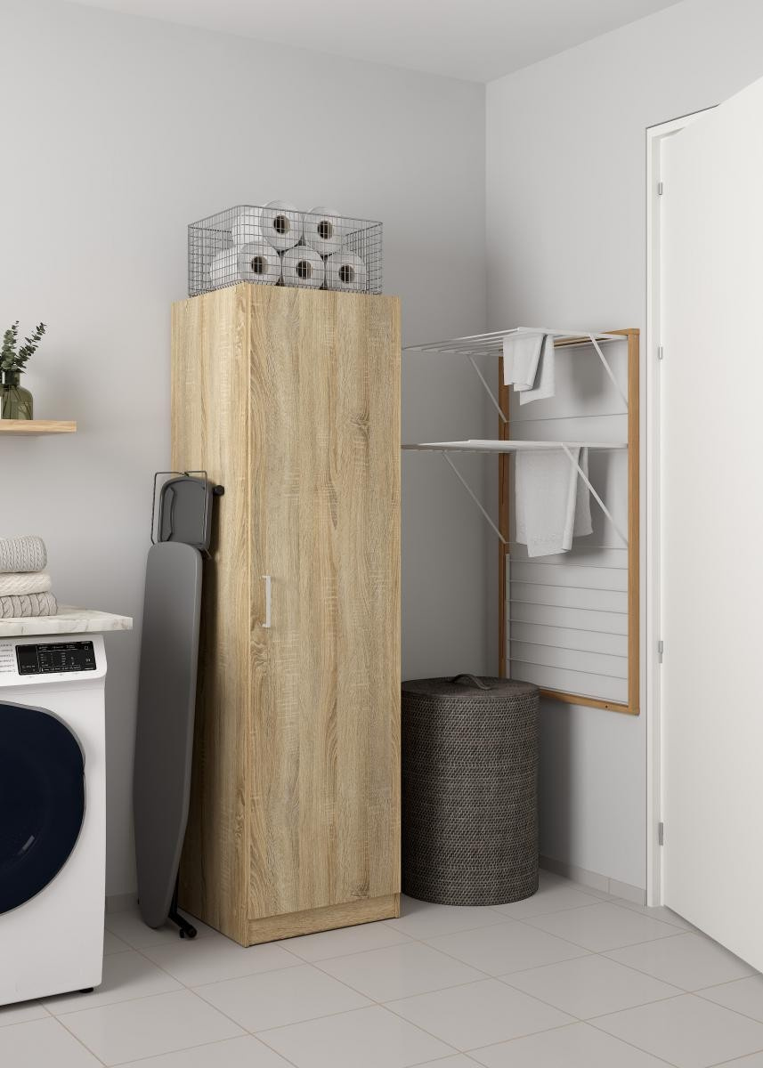 Univerzální skříň v přírodním dekoru tmavšího dubu sonoma je praktickým a nadčasovým řešením úložného prostoru do koupelny, prádelny, technické místnosti i chodby. Díky svému minimalistickému designu snadno zapadne do moderního i klasického interiéru a nabídne přesně to, co od funkční skříně očekáváte – přehlednost, variabilitu a dlouhou životnost.