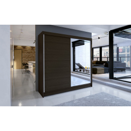 Skříň je vyrobena z kvalitního lamina. Díky svému vnitřnímu uspořádání nabízí dostatek úložného prostoru, posuvné dveře šetří prostor a zrcadlo ho opticky zvětšuje. Skříň je vhodná do ložnice, dětského nebo studentského pokoje, do předsíně i kanceláře. Vnitřní uspořádání skříně je vyobrazeno na fotografii. Skříň je dodávána v demontu. Součástí je i skleněné zrcadlo, které je nalepeno na jedné části dveří skříně a také montážní plánek včetně všech potřebných spojovacích materiálů. Vyobrazené dekorace nejsou v ceně.
