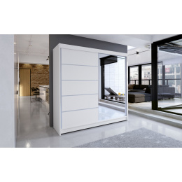 Skříň je vyrobena z kvalitního lamina. Díky svému vnitřnímu uspořádání nabízí dostatek úložného prostoru, posuvné dveře šetří prostor a zrcadlo ho opticky zvětšuje. Skříň je vhodná do ložnice, dětského nebo studentského pokoje, do předsíně i kanceláře. Vnitřní uspořádání skříně je vyobrazeno na fotografii. Skříň je dodávána v demontu. Součástí je i skleněné zrcadlo, které je nalepeno na jedné části dveří skříně a také montážní plánek včetně všech potřebných spojovacích materiálů. Vyobrazené dekorace nejsou v ceně.