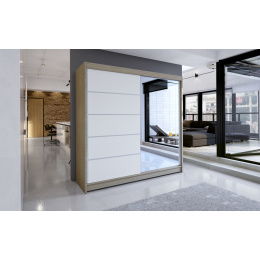 Skříň je vyrobena z kvalitního lamina. Díky svému vnitřnímu uspořádání nabízí dostatek úložného prostoru, posuvné dveře šetří prostor a zrcadlo ho opticky zvětšuje. Skříň je vhodná do ložnice, dětského nebo studentského pokoje, do předsíně i kanceláře. Vnitřní uspořádání skříně je vyobrazeno na fotografii. Skříň je dodávána v demontu. Součástí je i skleněné zrcadlo, které je nalepeno na jedné části dveří skříně a také montážní plánek včetně všech potřebných spojovacích materiálů. Vyobrazené dekorace nejsou v ceně.