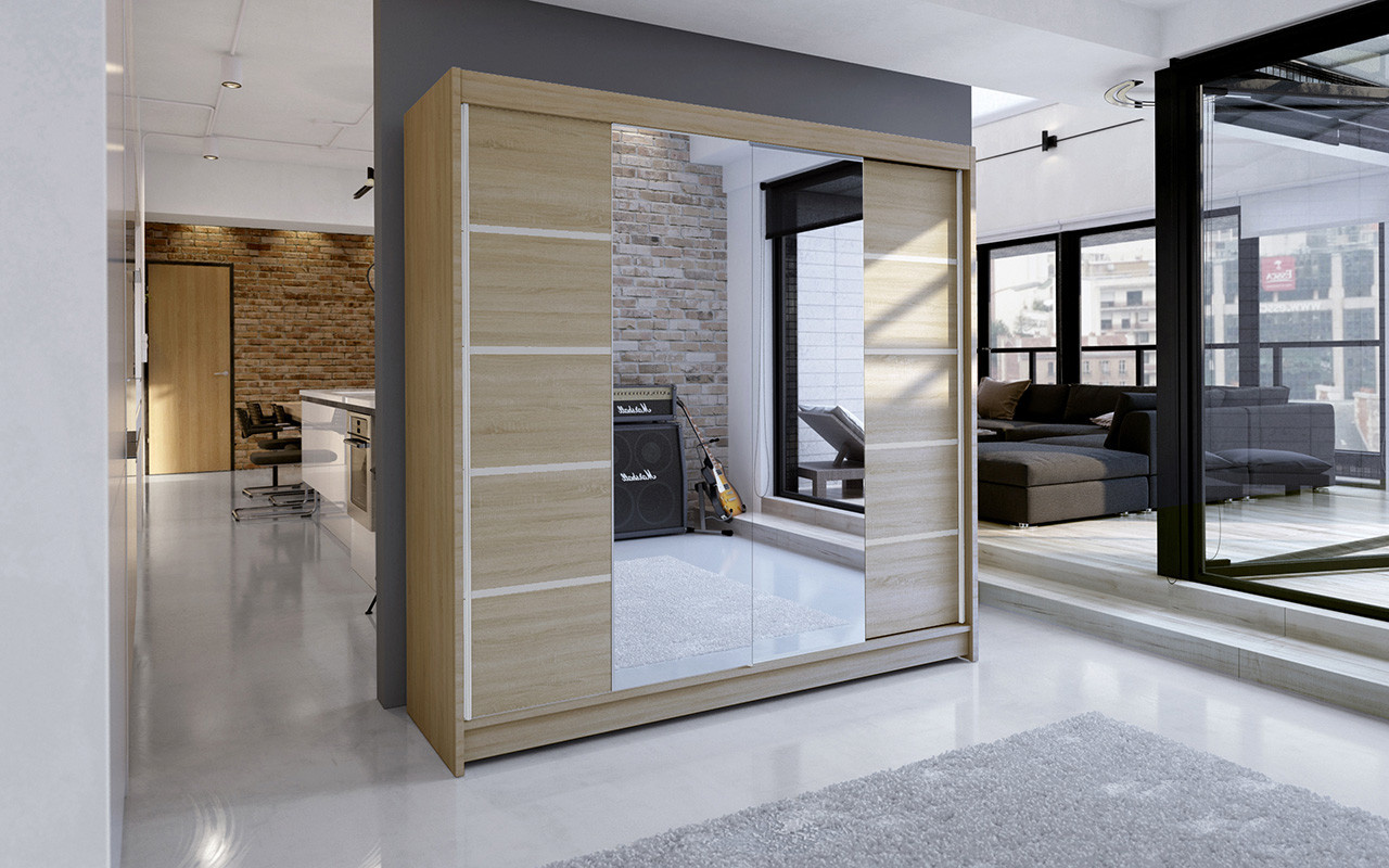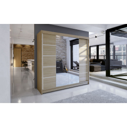 Skříň je vyrobena z kvalitního lamina. Díky svému vnitřnímu uspořádání nabízí dostatek úložného prostoru, posuvné dveře šetří prostor a zrcadlo ho opticky zvětšuje. Skříň je vhodná do ložnice, dětského nebo studentského pokoje, do předsíně i kanceláře. Vnitřní uspořádání skříně je vyobrazeno na fotografii. Skříň je dodávána v demontu. Součástí jsou i skleněná zrcadla, která jsou nalepena na dveřích skříně a také montážní plánek včetně všech potřebných spojovacích materiálů. Vyobrazené dekorace nejsou v ceně.