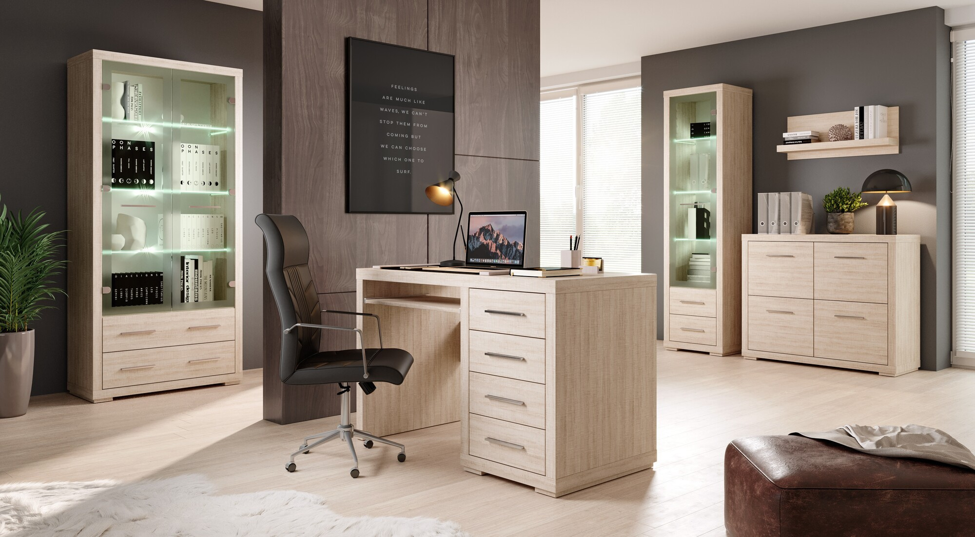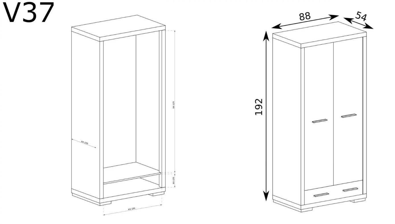 Dvoudveřová šatní skříň z kolekce Vegas. Má uprostřed tyč, která umožňuje vyplnit volný prostor nábytku. Pod ní se nachází zásuvka, která pojme mnoho oblečení, dokumentů nebo jiných doplňků. Kovové úchytky splývají s celým kusem nábytku a dokonale podtrhují jeho asertivní charakter. Hodí se do obývacího pokoje, ložnice i pracovny.