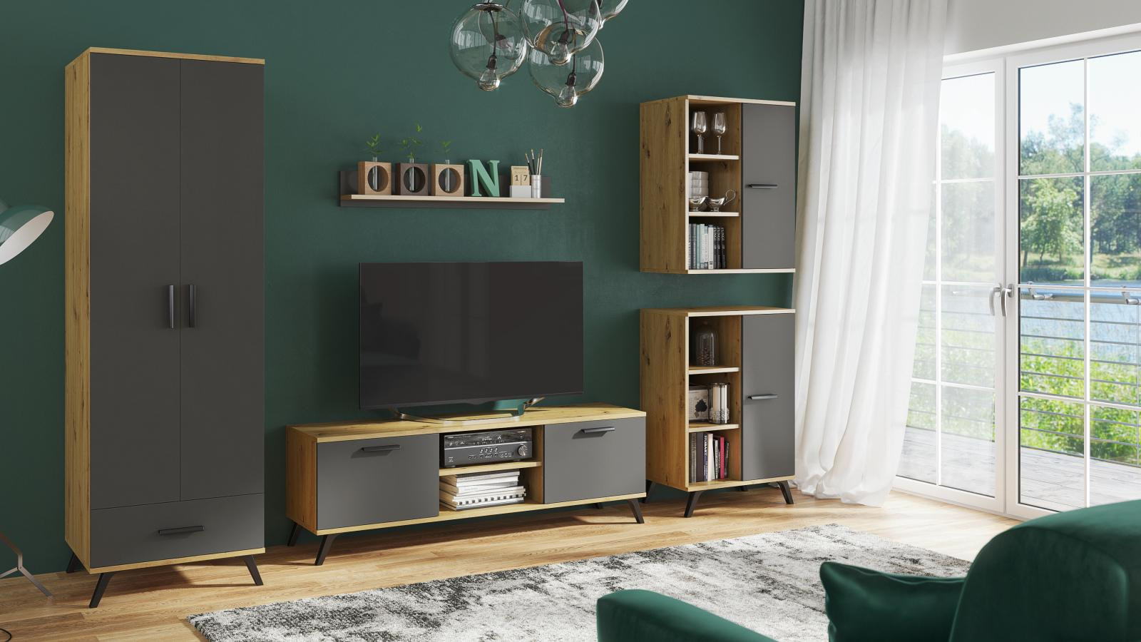 Skříň Roky 5 Grafit je vyrobena z lamina v krásném dekoru grafit a dub artisan. Lamino tloušťky 18 mm je odolné a je zakončeno lištou ABS. Jistě oceníte i snadnou údržbu. Skříň pojme vše potřebné a ve spodní části má také jeden šuplík. Rukojeti v dekóru dřeva jsou vyrobeny z plastu. Je dodávána v demontu. Součástí balení je montážní návod včetně všech spojovacích prvků.