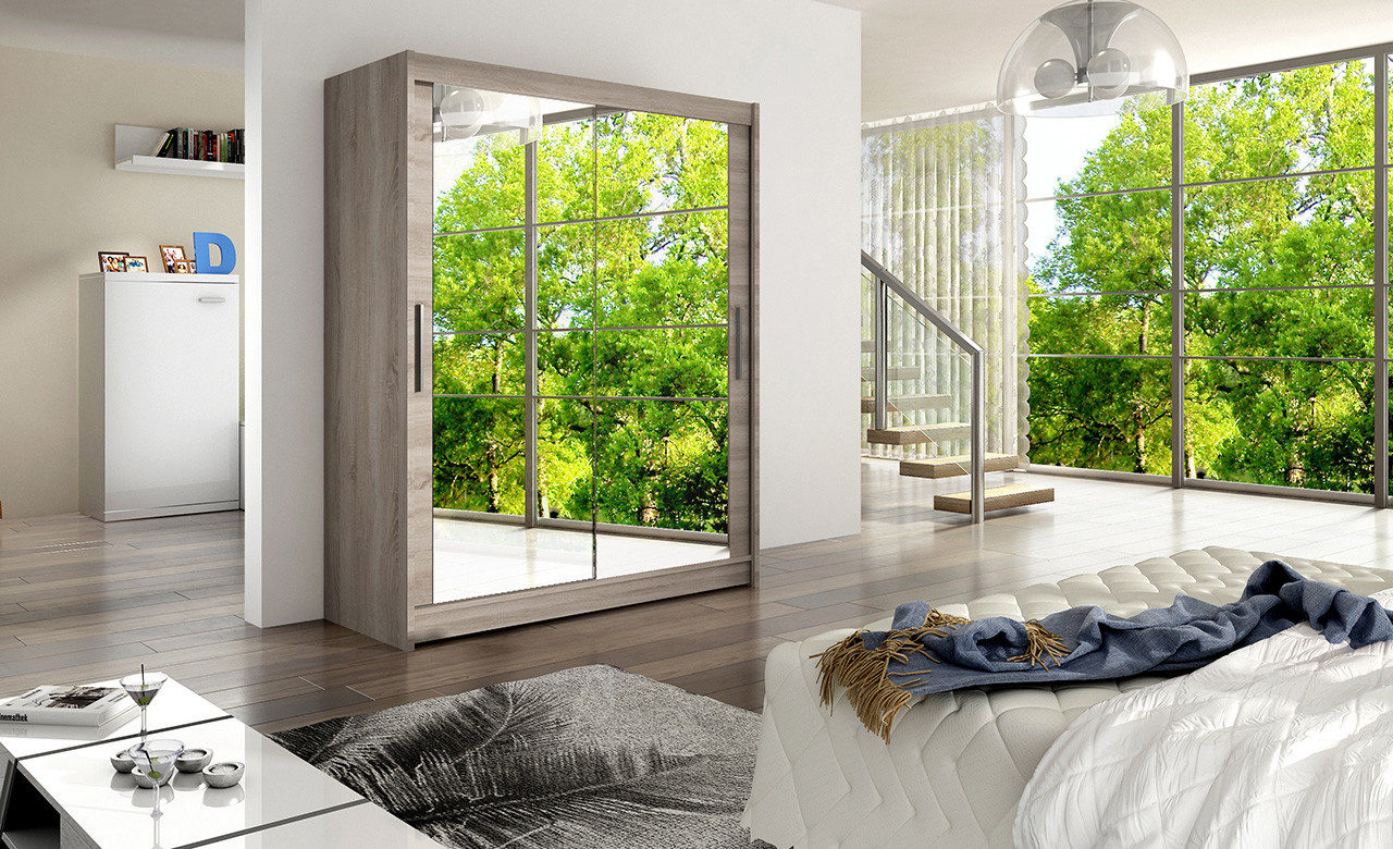 Jednoduchý a zárověň elegantní design skříně osloví i náročné zákazníky. Eleganci podtrhují dlouhé stříbrné úchyty a součástí jsou i velká skleněná zrcadla, která jsou nalepena na dveřích skříně. Je vyrobena z lamina o síle 16 mm a hrany jsou ukončeny ABS lištou. Vodící lišty jsou vyrobeny z odolného hliníku a splňují požadavky pro každodenní užívání. Díky svému uspořádání poskytuje dostatek úložného prostoru. Skvěle se hodí do ložnice, předsíně, dětského, nebo studentského pokoje. Skříň je dodávána v demontu a součástí je montážní plánek včetně všech potřebných spojovacích materiálů. Vyobrazené dekorace nejsou v ceně.