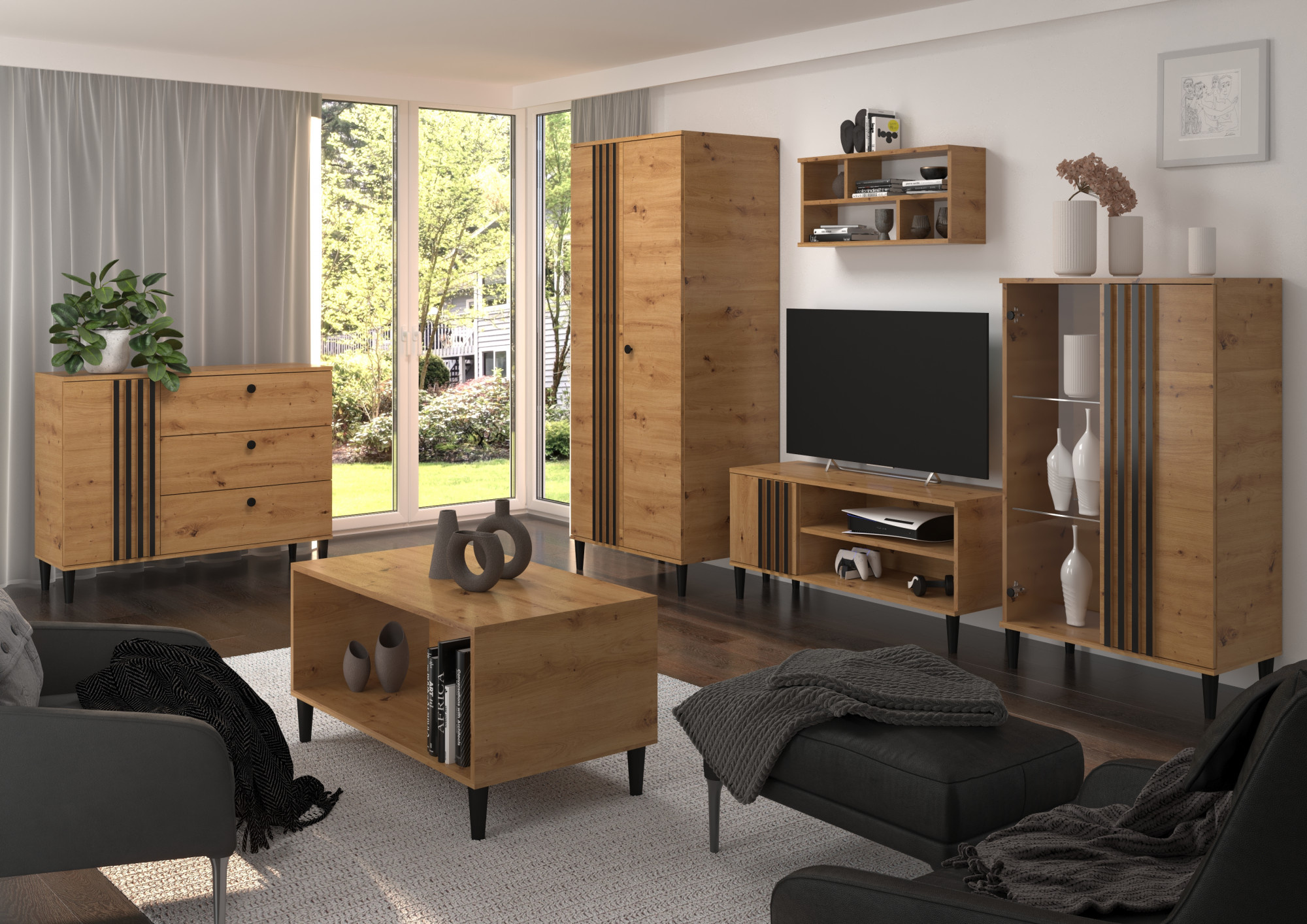Vysoká vitrína z kolekce LIVIA udržovaná v moderním stylu jistě přitahuje pozornost. Efekt přírodního dřeva podtrhují doplňky a vložky v černé barvě. Za skleněnými dveřmi se skrývá hluboká police, která umožní vystavit cenné památky či rodinné fotografie, a prostorná skříňka zajistí dodatečný úložný prostor. Doporučujeme se seznámit s ostatními prvky kolekce LIVIA.
