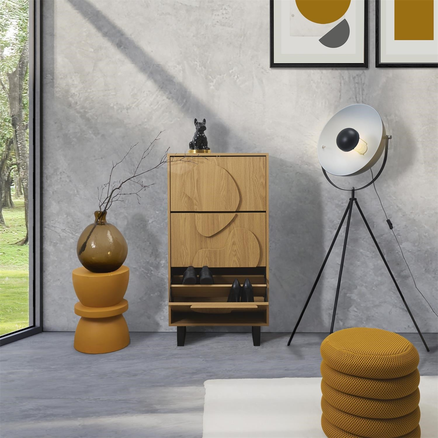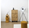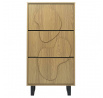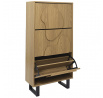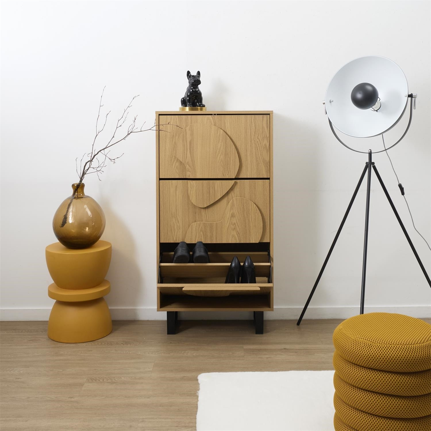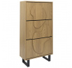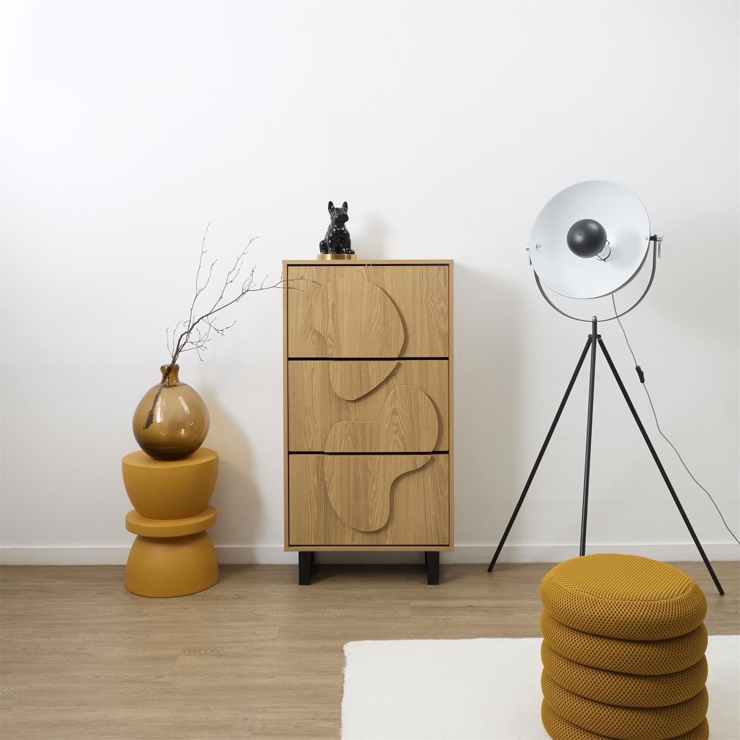 Skříňka na boty se 3 čely Calypso je kombinací designu a kvality. Skříňka byla vyrobena z MDF desky s dýhou imitující dub. Dvířka skříňky se otevírají, aby bylo možné snadno vložit a vyjmout umístěné boty. Tři čelní strany skříněk skrývají místo pro přibližně 12 párů bot typu tenisky. Umístění vyšších nebo širších bot může snížit počet párů, které do ní budeme moci uložit. Úchyty skříněk mají vypouklý nepravidelný tvar, který odkazuje na styl japandi. Základem skříňky jsou nohy ve tvaru lyžin. Nohy byly vyrobeny z kovu lakovaného práškovou barvou. Skříňka vyžaduje montáž. Max. zatížení na 1 zásuvku 6 kg. Max. zatížení na skříňku (zásuvky + horní deska) 30 kg. Hmotnost skříňky 25 kg. Rozměry kartonu: 37,5x15x119cm