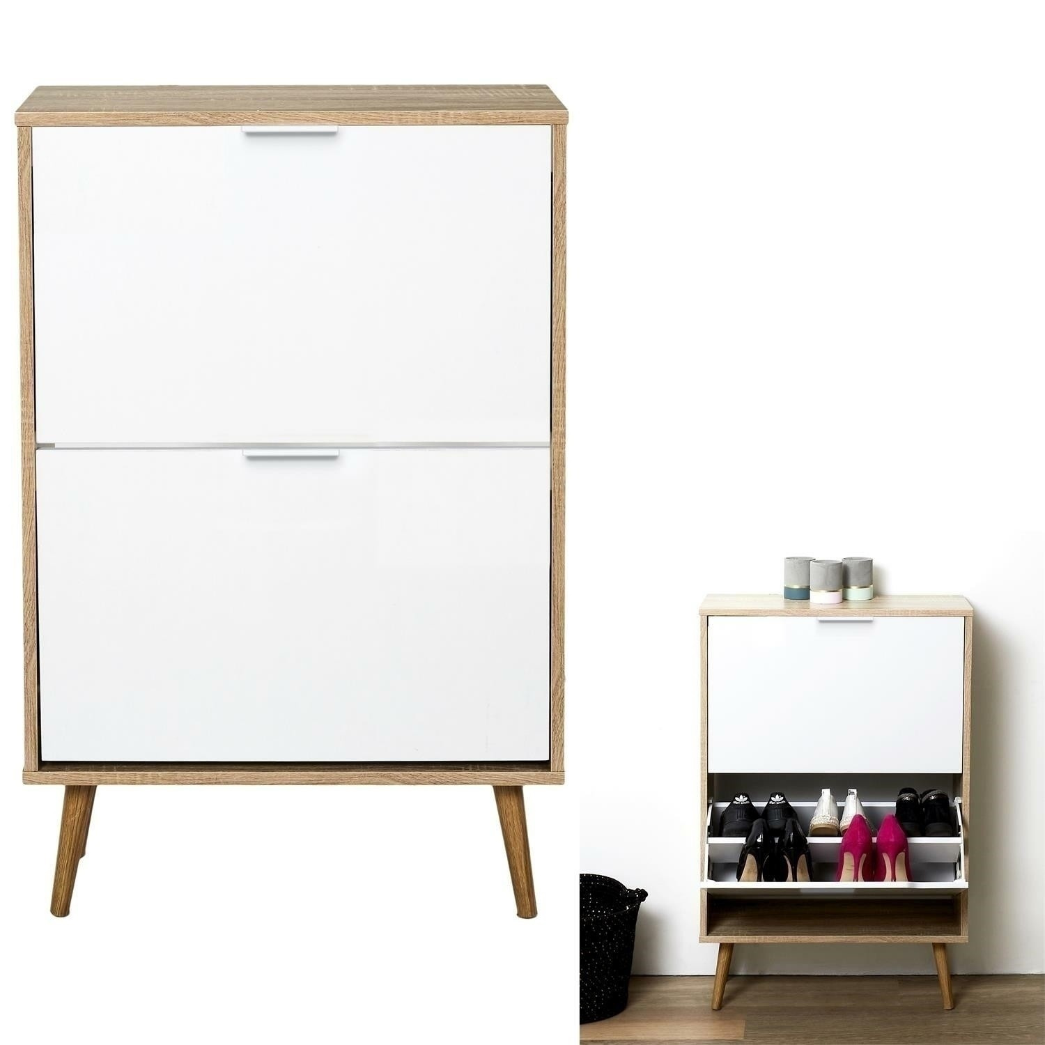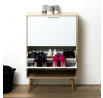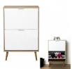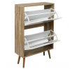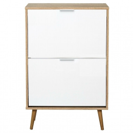 Mělká skříňka na boty v bílé barvě s čelními plochami v dřevěné dýze je dvoudveřový nábytek, který pomůže uspořádat obuv v předsíni. Skříňka s hloubkou 23,5 cm je ideálním nábytkem do malé předsíně. Skříňka má dvě čela, která se vyklápějí. Do čel byly namontovány speciální police na boty. Skříňka byla vyrobena z MDF desky, která je odolná a jistě nám poslouží po mnoho let. Bílá skříňka na boty je ideální nábytek do světlé garsonky nebo interiéru ve skandinávském stylu. Výška nožek 16 cm.