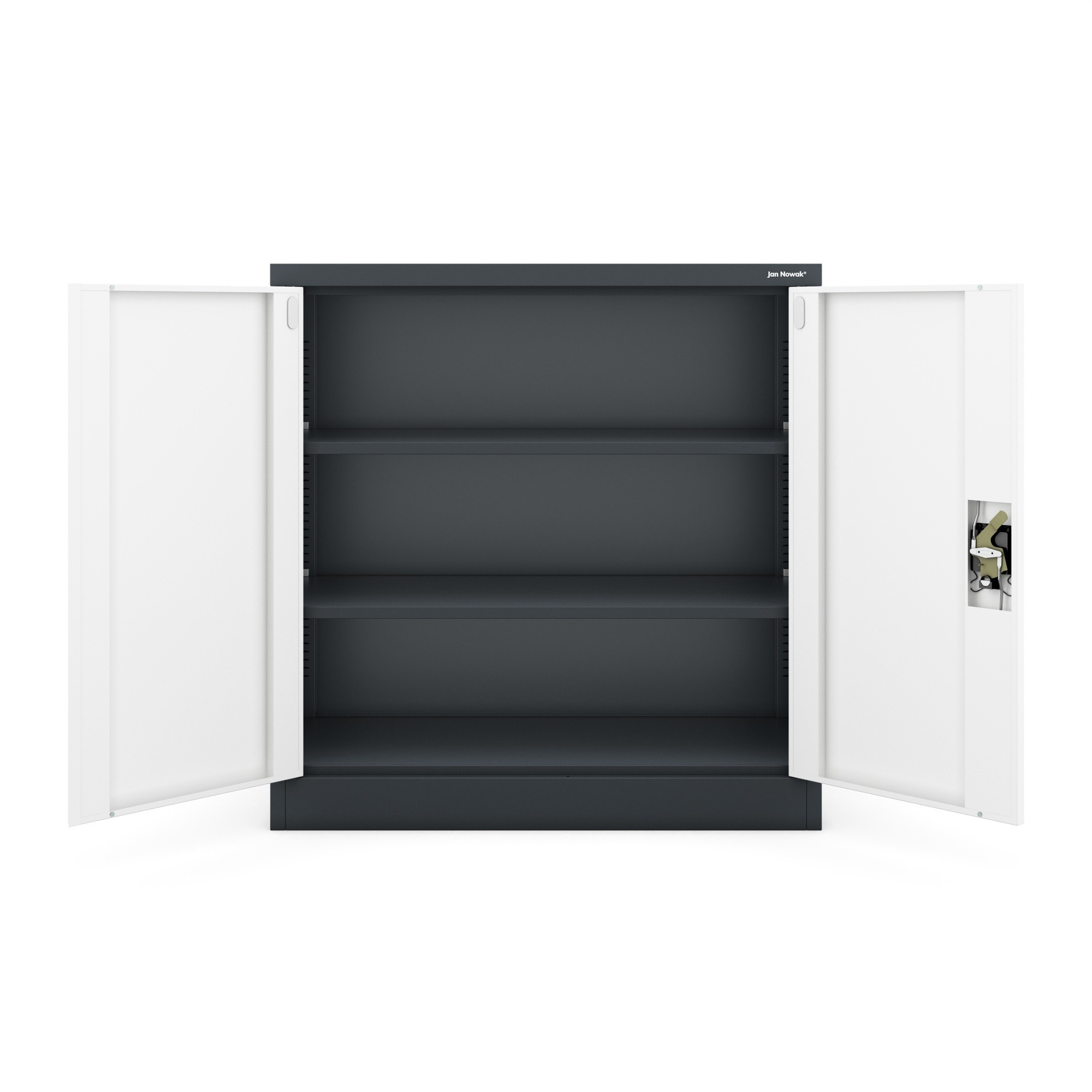 Vnitřní prostor skříňky je rozdělen dvěma nastavitelnými policemi, které vám umožní přizpůsobit si uspořádání podle vašich potřeb. Výšku polic lze snadno měnit po 25 mm, takže si můžete vytvořit prostor pro šanony různých velikostí, krabice s dokumenty nebo jiné kancelářské potřeby. Uvnitř skříňky se pohodlně vejde až 25 šanonů.