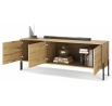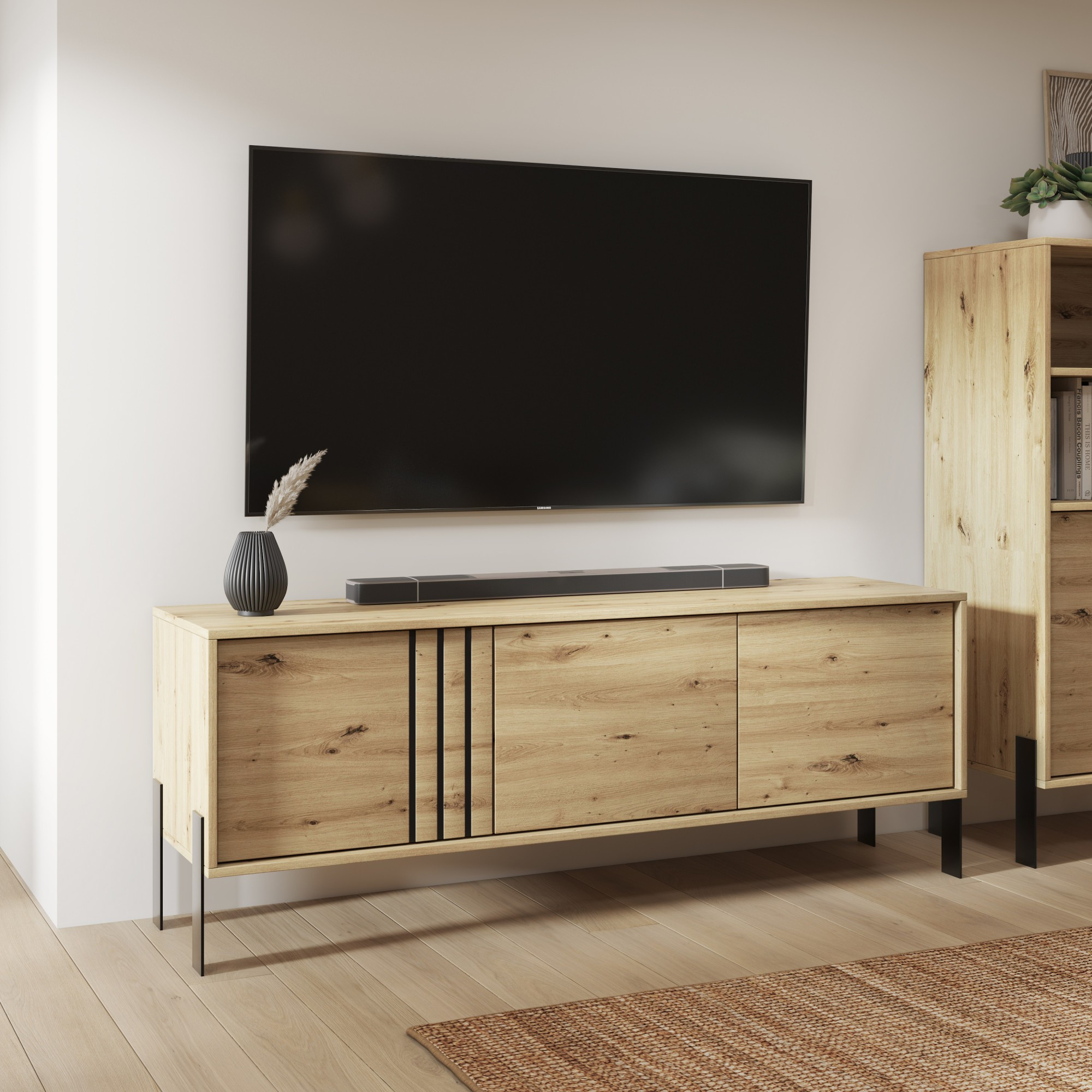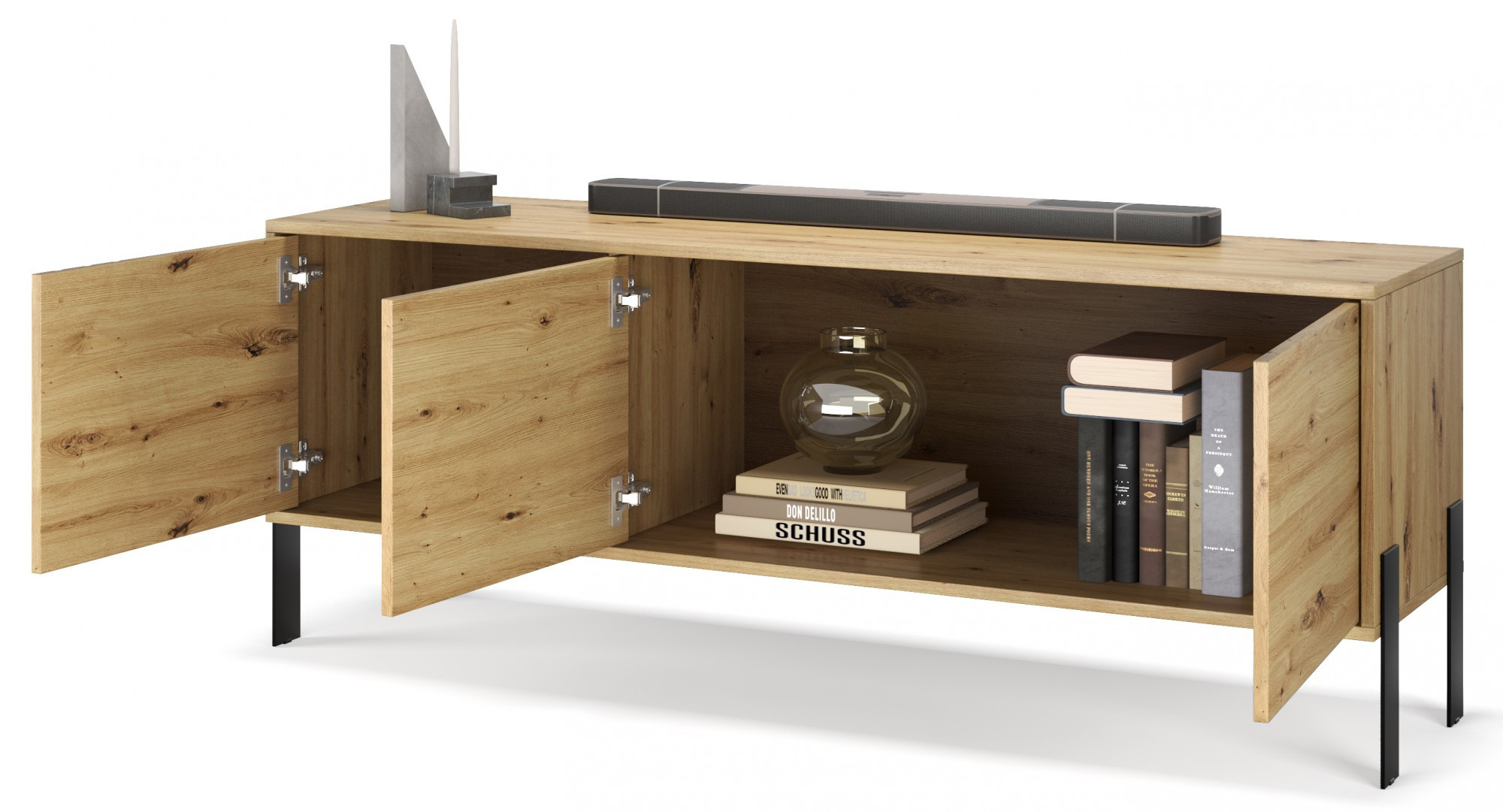 Moderní TV skříňka **Nexo** je kombinací elegance, funkčnosti a nadčasového designu. Skvěle se hodí do obývacího pokoje jako stylový podstavec pod televizi a praktické místo pro uložení multimediálního vybavení a příslušenství. Minimalistická forma byla obohacena o jemné dekorativní detaily, které nábytku dodávají výjimečný charakter. Čela ve variantě **Artisan** zdůrazňují přirozený vzhled dřeva, zatímco varianta **Kašmír** přináší do interiéru eleganci a moderní styl. Celá konstrukce je postavena na stabilních kovových nohách, které dodávají lehkost konstrukci a usnadňují udržování čistoty pod nábytkem.