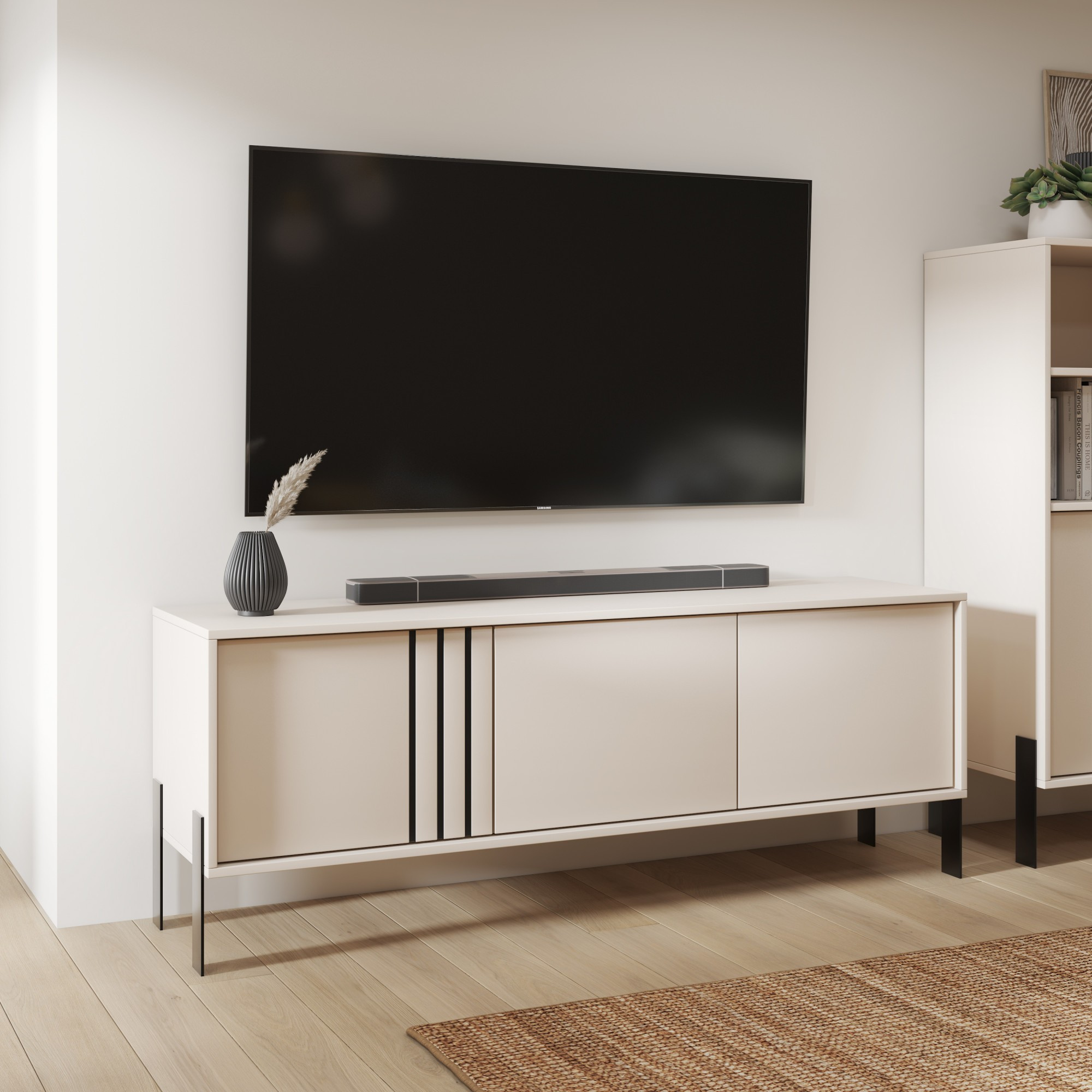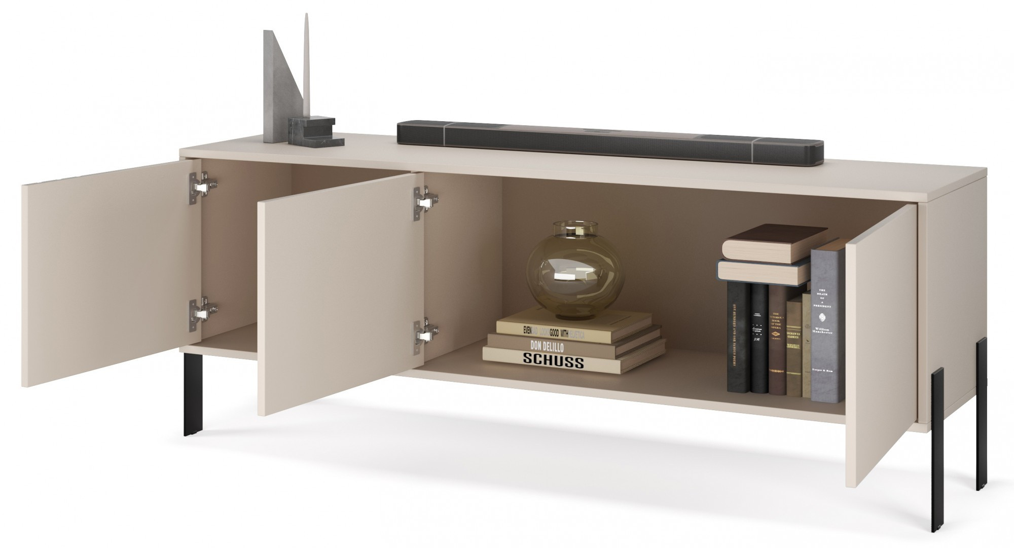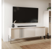 Moderní TV skříňka **Nexo** je kombinací elegance, funkčnosti a nadčasového designu. Skvěle se hodí do obývacího pokoje jako stylový podstavec pod televizi a praktické místo pro uložení multimediálního vybavení a příslušenství. Minimalistická forma byla obohacena o jemné dekorativní detaily, které nábytku dodávají výjimečný charakter. Čela ve variantě **Artisan** zdůrazňují přirozený vzhled dřeva, zatímco varianta **Kašmír** přináší do interiéru eleganci a moderní styl. Celá konstrukce je postavena na stabilních kovových nohách, které dodávají lehkost konstrukci a usnadňují udržování čistoty pod nábytkem.