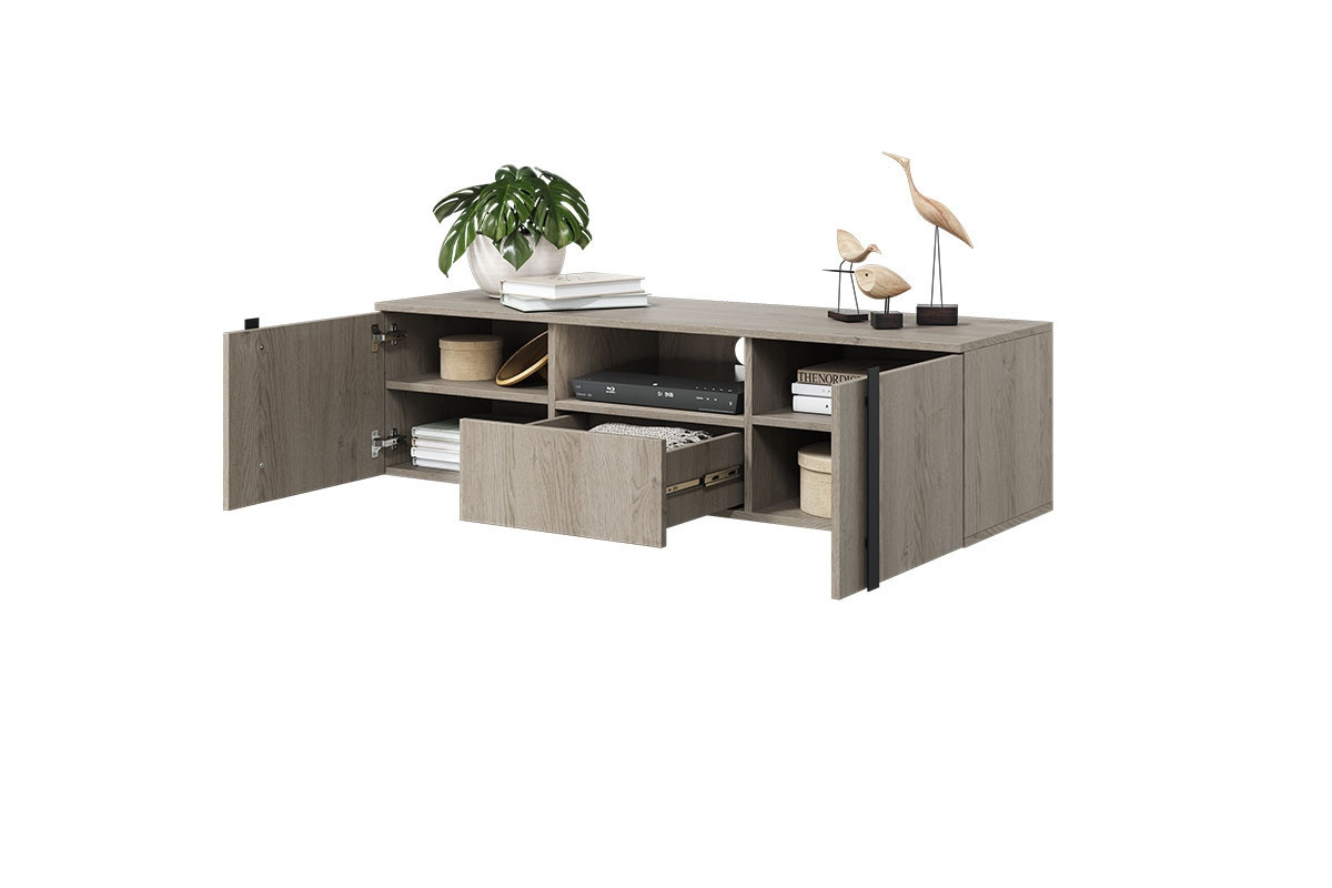 Závěsná TV skříňka Verica 150 cm s výklenkem - dub biskvitový / černé úchyty