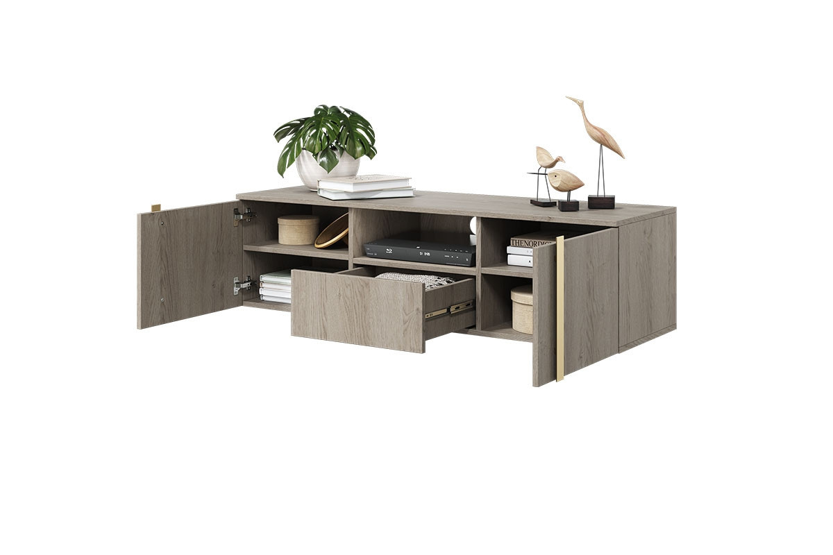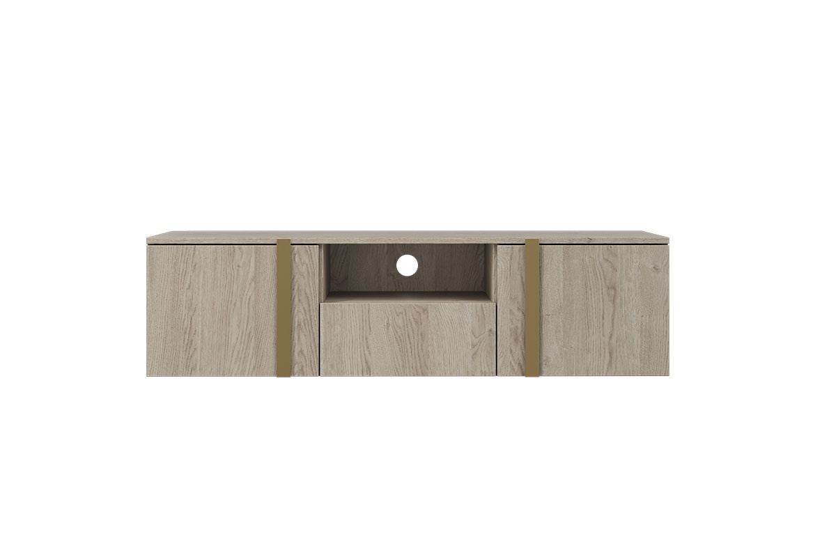Závěsná TV skříňka Verica 150 cm s výklenkem - dub sušenka / zlaté úchyty, Šířka: 150, Výška: 40, Hloubka: 45