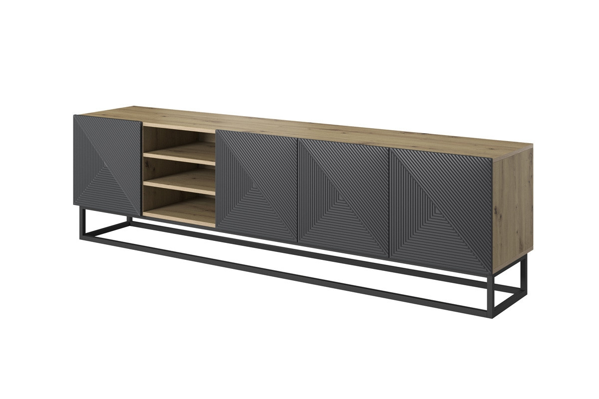 Zařizujete si obývací pokoj? Hledáte skříň RTV, která bude originálním doplňkem vašeho domova? Podívejte se na tento návrh s černými čely a skříňkou v odstínu dub artisan. Model má zajímavě uspořádaný interiér - obsahuje čtyři prostorné skříňky a tři police, na které můžete umístit zajímavé dekorace nebo potřebné vybavení RTV. Celá konstrukce nábytku spočívá na stabilní designové základně. Dodejte svému interiéru vznešenou chuť - vsaďte na tento model! Asha drážkovaná RTV skříňka 200 cm s výklenkem na kovovém rámu - artisan / rivier stone matt, šířka: 200, výška: 56, hloubka: 40, výška nožiček: 16.