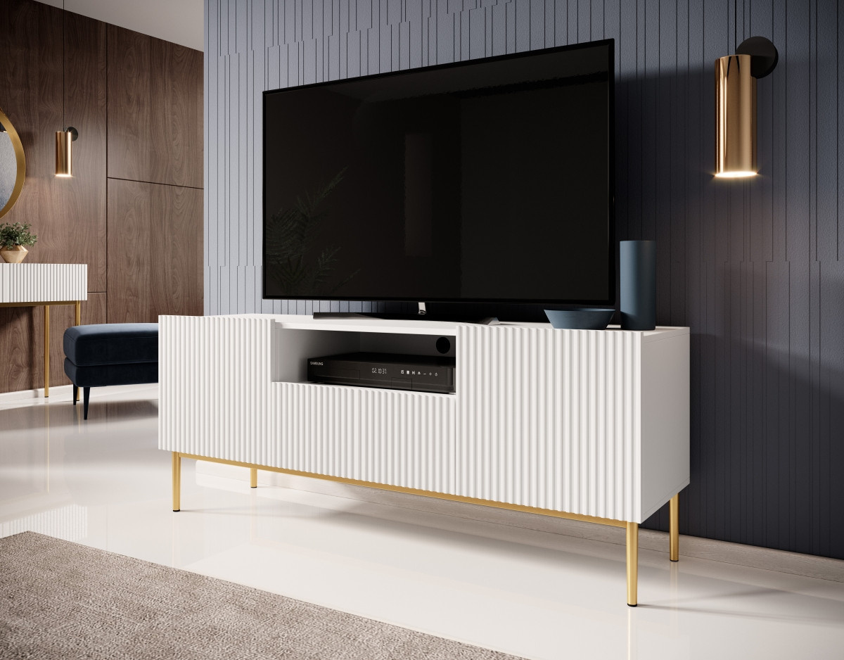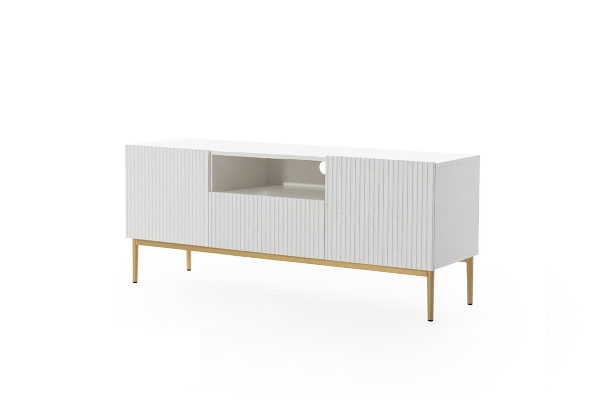 RTV skříňka 150 cm Nicole s drážkovaným čelem a zásuvkou - bílý mat / zlaté nohy, šířka: 150, výška: 60, hloubka: 45, výška nohou: 20