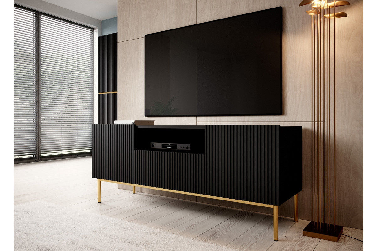 RTV skříňka 150 cm Nicole s rýhovaným čelem a zásuvkou - černý mat / zlaté nožky, Šířka: 150, Výška: 60, Hloubka: 45, Výška nožek: 20