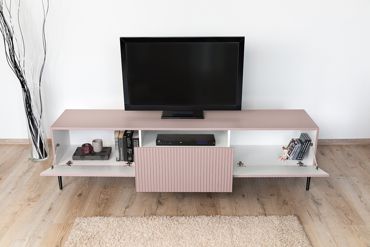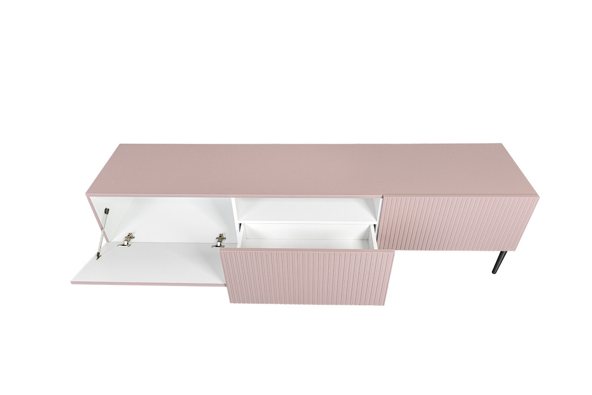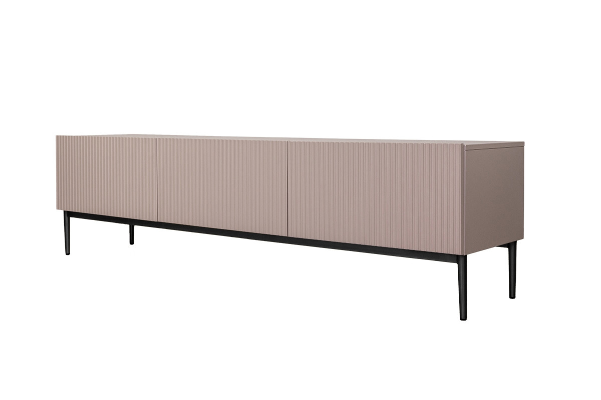 Hledáte skříňku, která ozdobí váš interiér? Máš dost otřepaných modelů, které potkáváš v každém druhém domě? Mám pro tebe něco speciálního! Tento elegantní a velmi reprezentativní nábytek v odstínu antické růže obohatí aranžmá interiérů udržovaných ve stylu glamour. Dodají jim zajímavý akcent a oslnivý lesk. Co více, jeho atraktivní design není jeho jedinou předností. Skříňka díky velkému množství polic umístěných uvnitř a prostorné zásuvce se stává velmi funkčním modelem. Navíc má pevný rám a odolnou konstrukci. Stručně řečeno – vysněný nábytek.Skříňka RTV 200 cm Nicole s rýhovaným čelem a zásuvkou - antická růžová MDF / černé nožky, Šířka: 200, Výška: 53, Hloubka: 45, Výška nožek: 20.