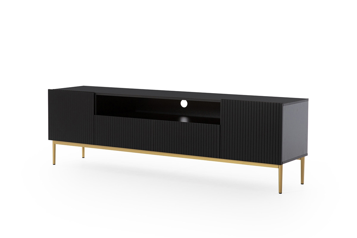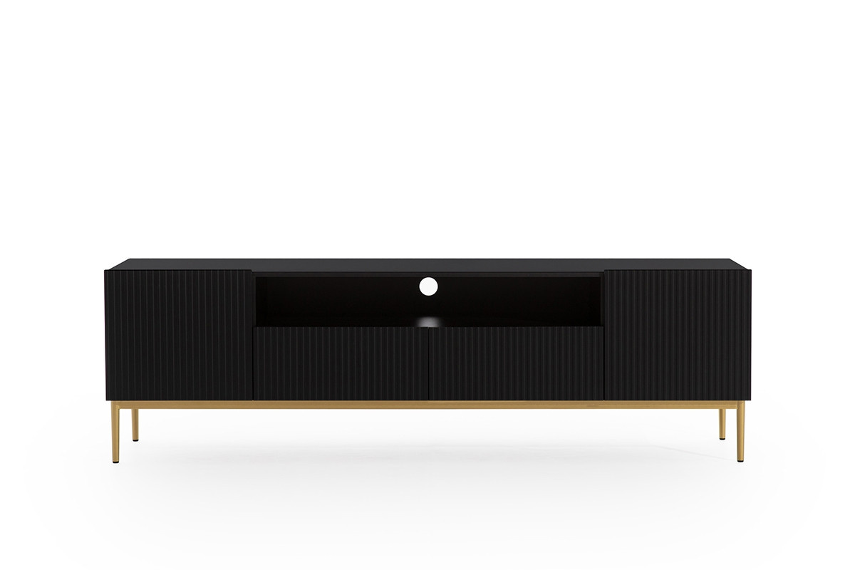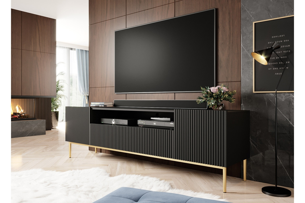 Hledáte skříňku, která ozdobí váš interiér? Máš dost otřepaných modelů, které potkáváš v každém druhém domě? Mám pro tebe něco speciálního! Tento elegantní a velmi reprezentativní nábytek v černém odstínu obohatí aranžmá interiérů ve stylu glamour. Dodají jim zajímavý akcent a oslnivý lesk. Ačkoliv, jeho atraktivní design není jedinou předností. Skříňka díky velkému množství polic umístěných uvnitř a dvěma prostorným zásuvkám se stává velmi funkčním modelem. Navíc má pevný rám a odolnou konstrukci. Stručně řečeno – vysněný nábytek. RTV skříňka 200 cm Nicole s drážkováním se zásuvkami a výklenkem - černý mat / zlaté nožky, Šířka: 200, Výška: 60, Hloubka: 45, Výška nožek: 20.