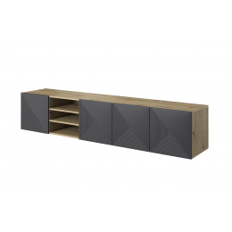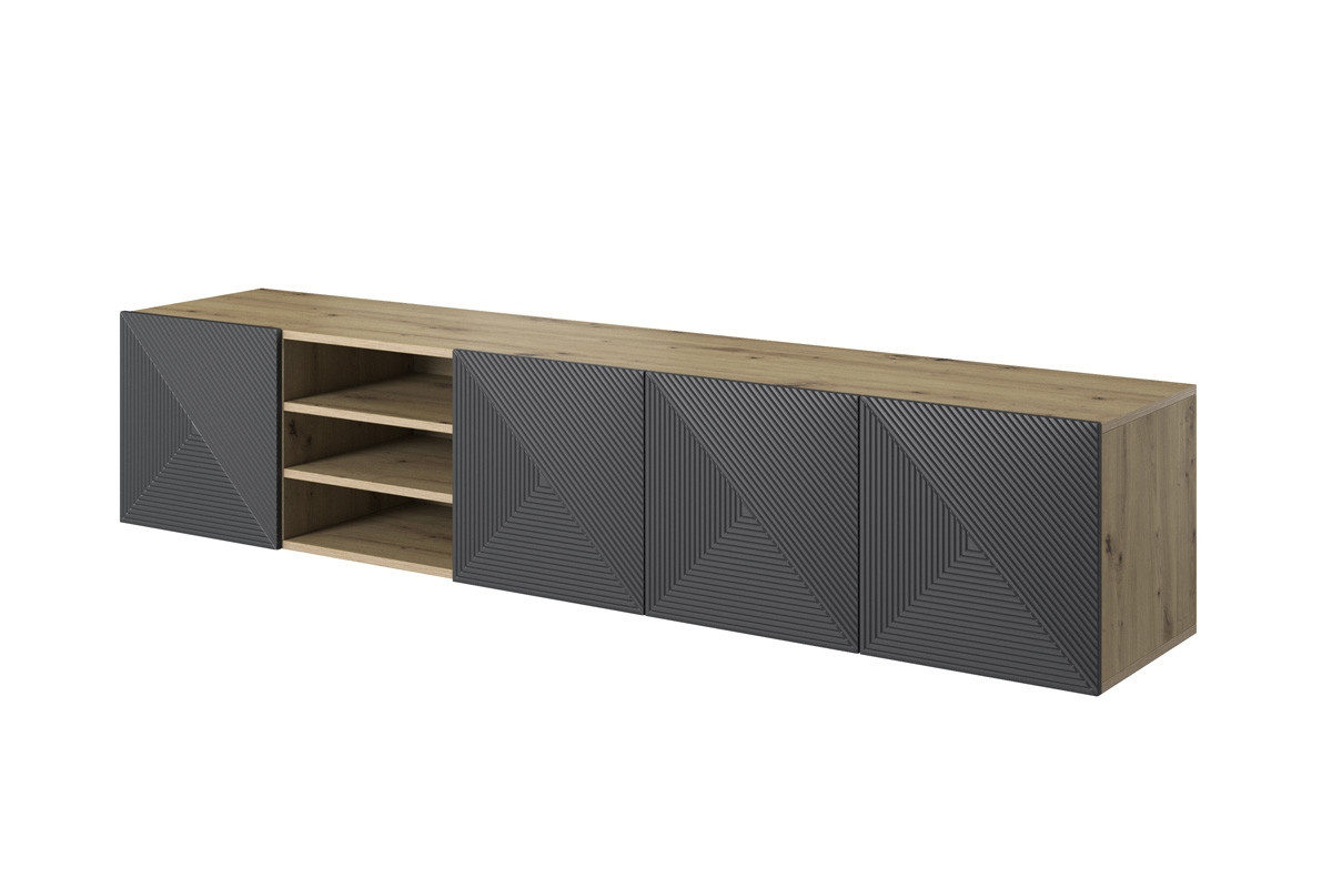 Jsi uprostřed zařizování svého obývacího pokoje? Hledáte závěsnou TV skříňku, která bude originálním prvkem vašeho domova? Věnujte pozornost této nabídce v odstínu černé a dubu artisan. Model má zajímavě uspořádaný interiér - obsahuje čtyři prostorné skříňky a tři police, na které lze umístit zajímavé dekorace nebo nezbytné RTV vybavení. Celá konstrukce nábytku je založena na stabilním, designovém základu. Dodej svému interiéru vytříbený vkus – zvol tento model! Závěsná TV skříňka 200 cm Asha s drážkováním a výklenkem - artisan / rivier stone mat, Šířka: 200, Výška: 40, Hloubka: 40.