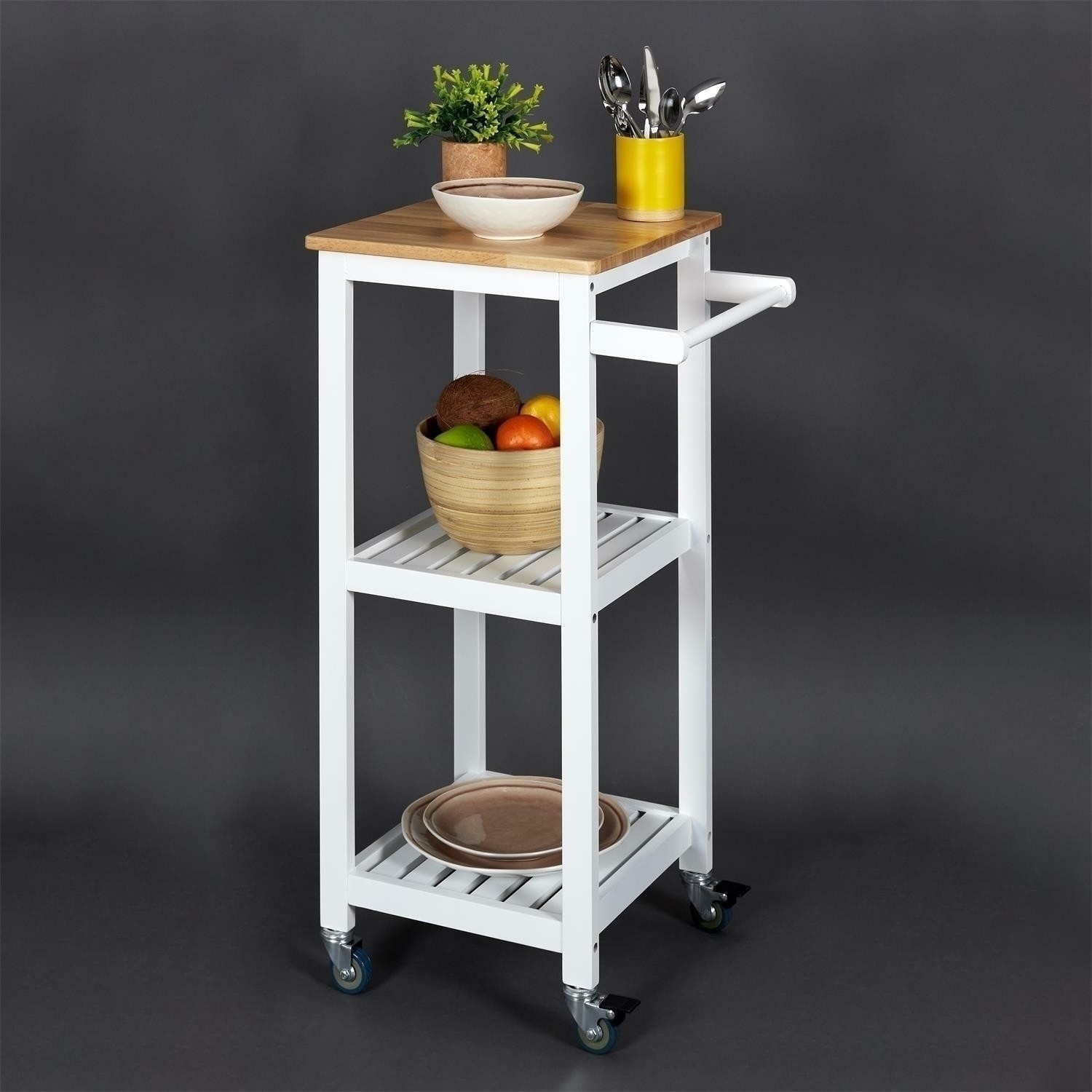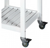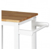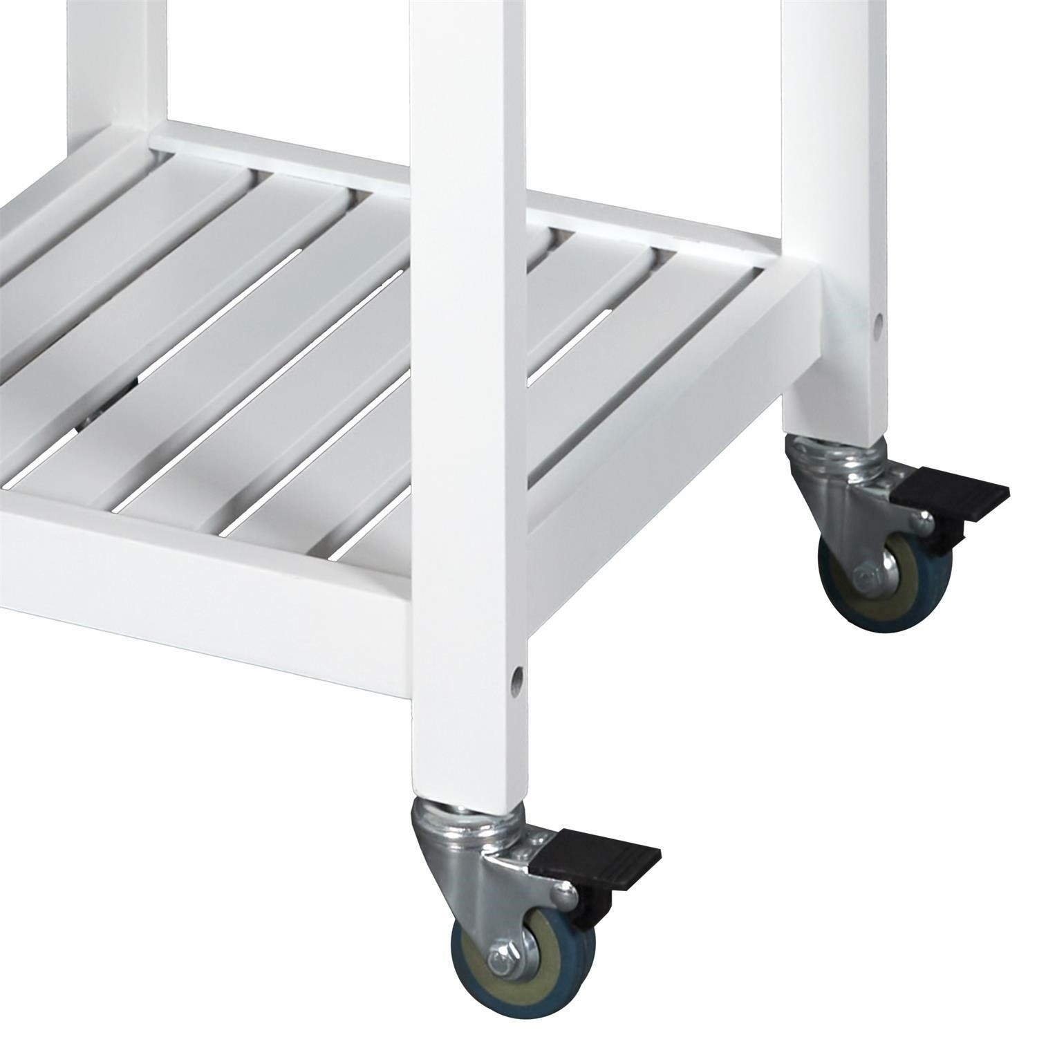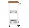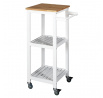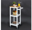 Bílý kuchyňský vozík je multifunkční nábytek, který můžeme využít nejen k ukládání zeleniny nebo koření. Vozík může sloužit také jako dodatečná pomocná plocha v kuchyni nebo jídelně. Vozík Bish může také sloužit jako bar na kolečkách, protože má držadlo, pomocí kterého ho můžeme přesouvat. Vozík má dvě bílé prolamované police a desku s dýhou imitující dřevo. Vozík byl vyroben z velmi odolné MDF desky. Rozměry desky: 37x37 cm Hmotnost nábytku: 5,5 kg Rozměry balení: 12,00 × 39,00 × 79,00 cm Max. zatížení 5 kg na polici